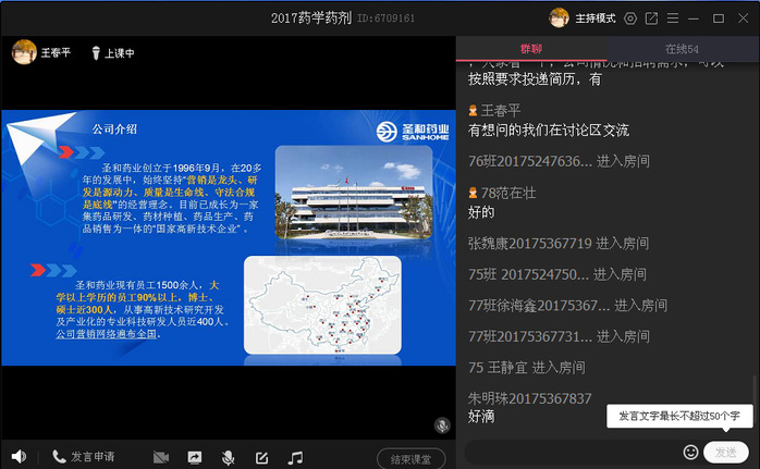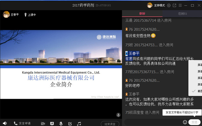 河南君和实业股份集团负责人通过腾讯会议的形式对自己的公司做了介绍,对今年的人才需求、用人要求、简历投递方式等方面做了详细讲解,并在讨论区和同学进行了积极的互动交流;南京圣和药业有限公司、华润河南医药、阿斯利康、康达洲际医疗器械有限公司等几家企业,在和书院就业专干王春平老师深入沟通之后将自己的校招PPT发给王春平老师,由王春平老师给学生做宣传和讲解,王春平老师根据他们的用人需求,分别在11月26和27日通过群课堂的形式对2021届药学毕业生,对各企业的情况、用人需求和要求、薪资待遇、简历投递等方面结合PPT和自己掌握的信息进行了详细的讲解,并就讨论区同学的问题进行了一一回复。