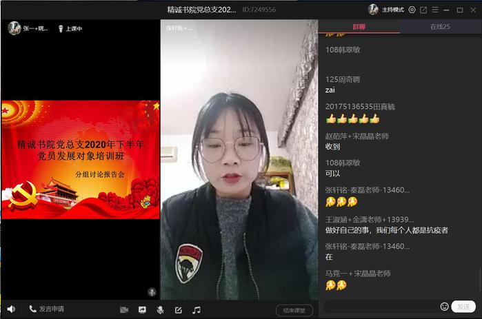 为深入领会习近平新时代中国特色社会主义思想,有效提升党员发展对象的思想觉悟,加深对党的基本理论知识的理解,精诚书院党总支根据学院《关于举办2020年下半年党员发展对象培训班的通知》文件要求,于11月23日通过线上和线下的方式召开了党员发展对象学习研讨会。其中实习生和见习生通过QQ课堂的方式开展,在校生在精诚书院党员活动室开展。