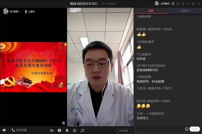 为深入领会习近平新时代中国特色社会主义思想,有效提升党员发展对象的思想觉悟,加深对党的基本理论知识的理解,精诚书院党总支根据学院《关于举办2020年下半年党员发展对象培训班的通知》文件要求,于11月23日通过线上和线下的方式召开了党员发展对象学习研讨会。其中实习生和见习生通过QQ课堂的方式开展,在校生在精诚书院党员活动室开展。