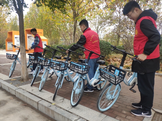 11月21日下午15时,平原校区在校生在秦磊老师的带领下,参加培训班的学员们穿上志愿者服装,由精诚书院出发按照计划路线依次整理了校园内多个停车网点的共享单车,虽然当天下午的气温很低,但同学们干劲十足,看着共享单车群在大家的努力下整齐摆放,同学们都由衷地感到开心。之后,大家来到精诚书院园区内,各自分工打扫了园区内的凉亭,走廊的落叶和垃圾,并且在门洞处用抹布将展台和栏杆擦拭干净。