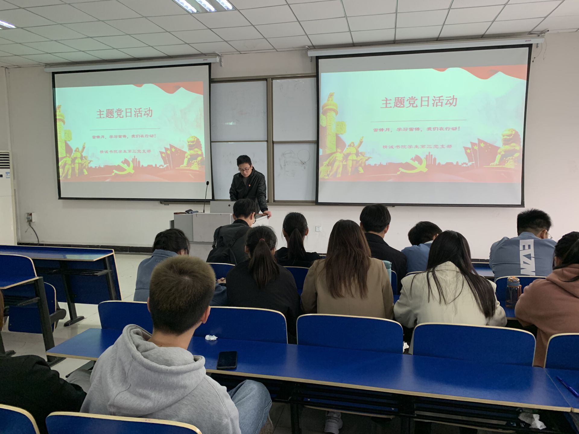 雷锋精神是我们中华民族宝贵的精神财富。它激励着一代又一代的青少年健康成长,促进了社会文明的进步。新时期新形势,雷锋精神也被赋予了新的内容和含义。3月12日,精诚书院学生第三党支部主题党日活动在第二教室顺利召开,党支部全体成员参加了此次主题党日活动。会议由支部书记姚志博主持。