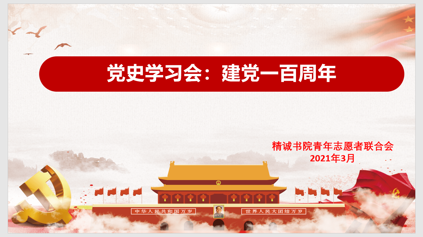 中国共产党已经走过了100年的风风雨雨,为回顾党的光辉历程,与党的历史使命同心同向,充分展现新时代大学生爱党、爱国、爱人民的情怀,3月17日晚,精诚书院青年志愿者联合会全体成员召开了“建党一百周年”学习会议。