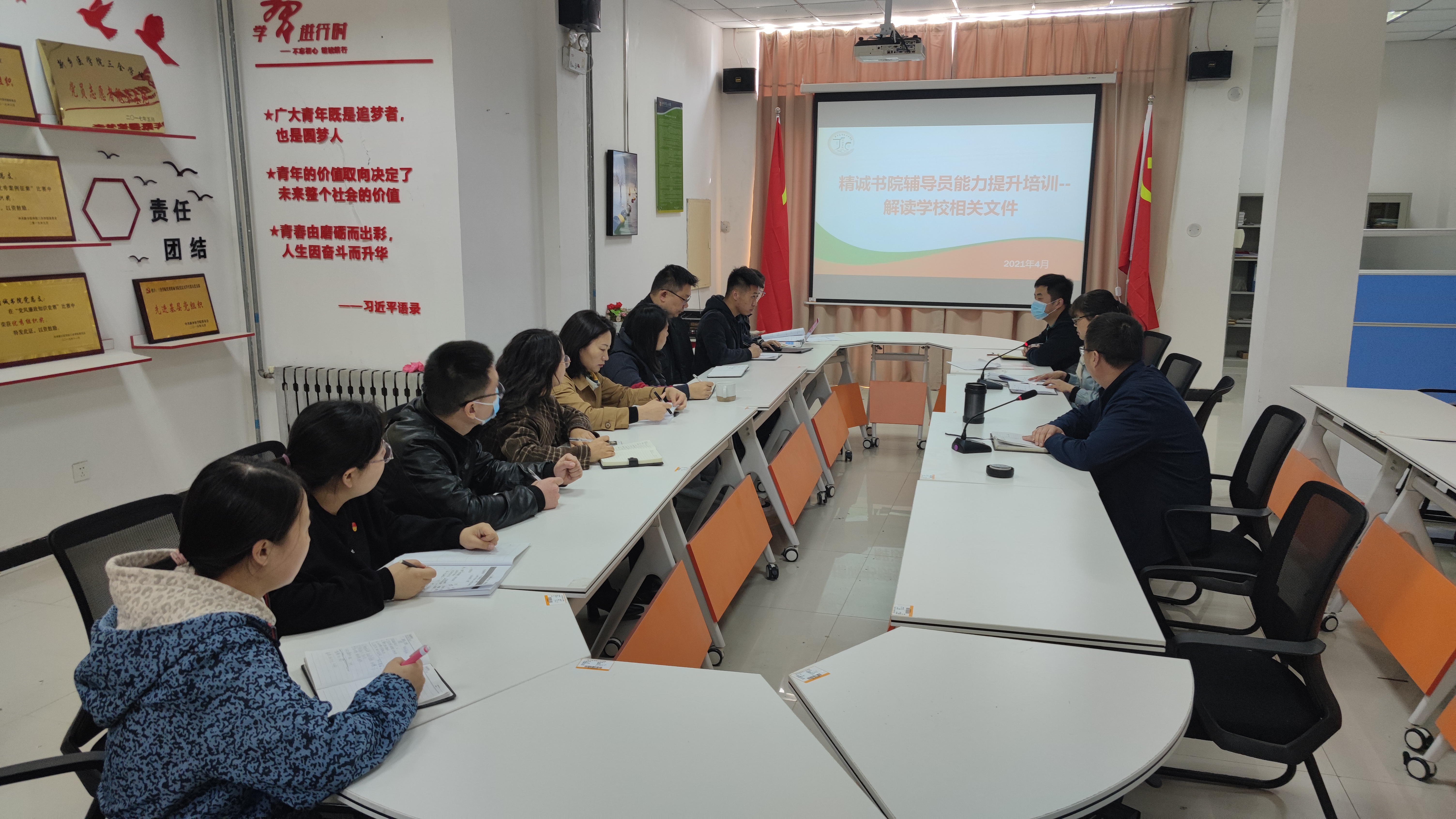 为进一步加强我书院辅导员队伍建设,落实立德树人根本任务,提升辅导员素质能力和工作水平,推动辅导员队伍专业化、职业化发展。4月13日上午,精诚书院在党员活动室开展了2021年度辅导员能力提升系列培训之解读学校相关文件精神,旨在引领辅导员的工作方向,助力辅导员成长。精诚书院书记张新、副书记万建苗及全体辅导员出席了本次培训会议。
