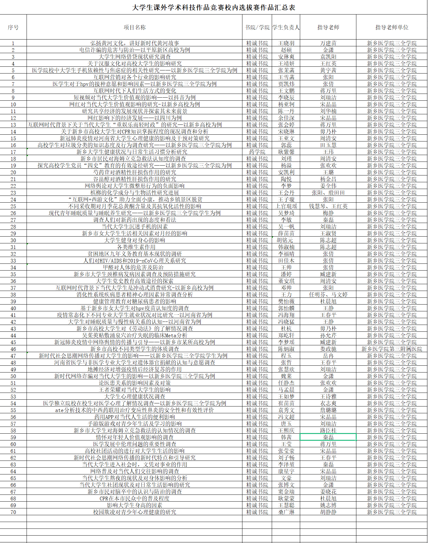 精诚书院团总支2021年3月开展新乡医学院三全学院挑战杯初赛,经过前期宣传、动员,精诚书院挑战杯共申请项目有70项,参与人数300余人,现将所有参赛项目进行公开展示。对参赛项目有疑问的同学可以电话、邮件或书面形式提出。