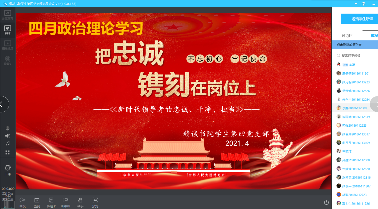 为进一步筑牢理想信念根基,精诚书院学生第四党支部于4月12日以线上形式开展政治理论学习,集中学习国防大学金一南教授题为《新时代领导者的忠诚、干净、担当》的专题讲座。