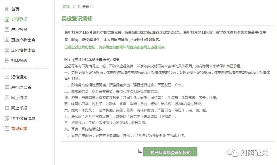 开始报名你会发现跟所有的软件安装一样,会让你阅读一大篇的使用说明。小编十分不建议你跟安装软件一样,直接点确定。在这个时候请详细阅读详细阅读 详细阅读(重说三)兵役登记须知。了解自己的各方面情况是否达标,这能避免后续工作出现的很多麻烦