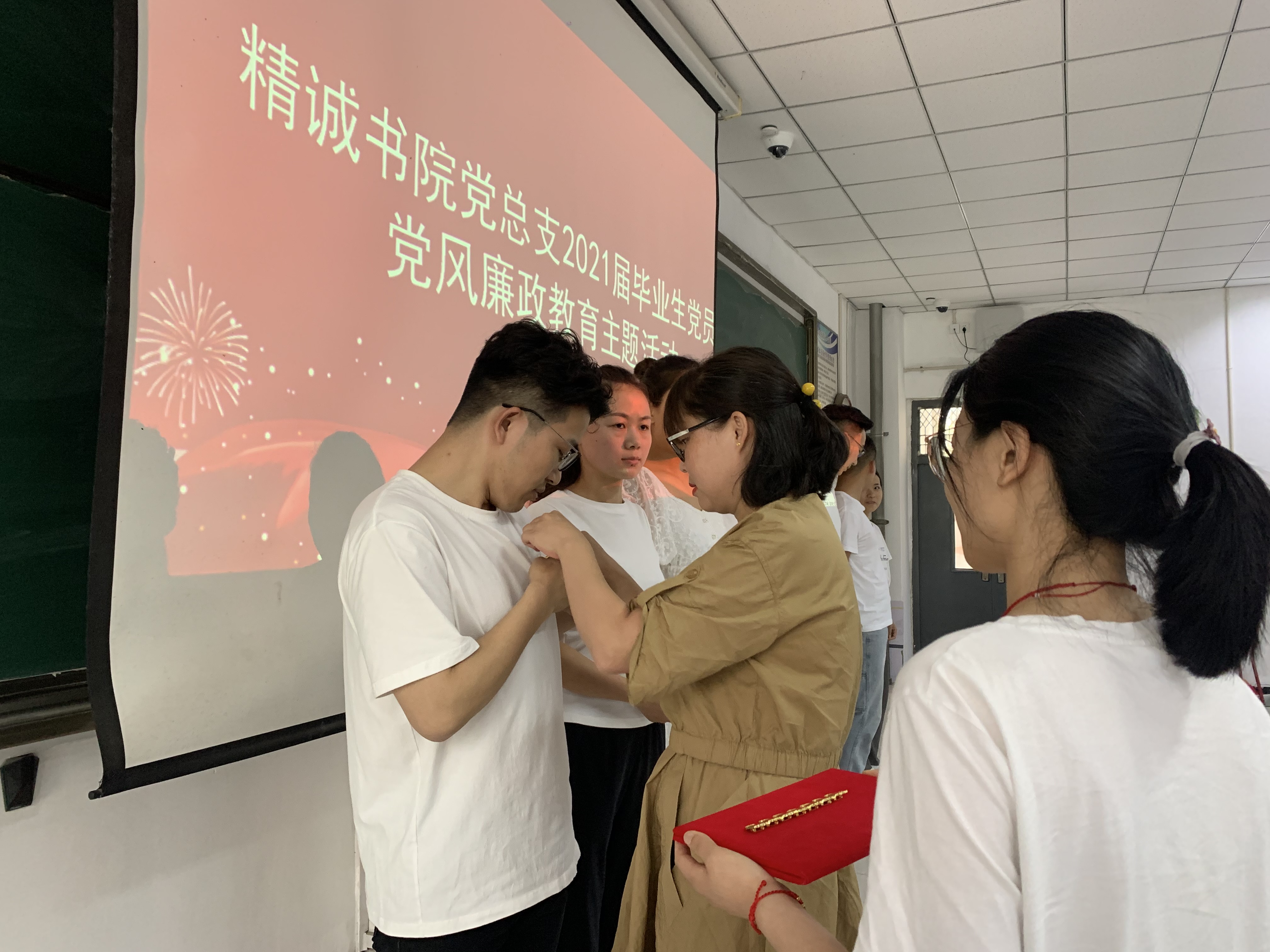 6月10日至11日,书院党总支副书记万建苗为书院优秀毕业生党员赠送党员徽章,将一枚枚金光闪闪的党徽佩戴在毕业生党员左胸前,强化党员组织意识,时刻要想到自己党员的“第一身份”,不忘自己应尽的义务和责任,充分发挥党员的先锋模范作用,自觉接受群众监督。