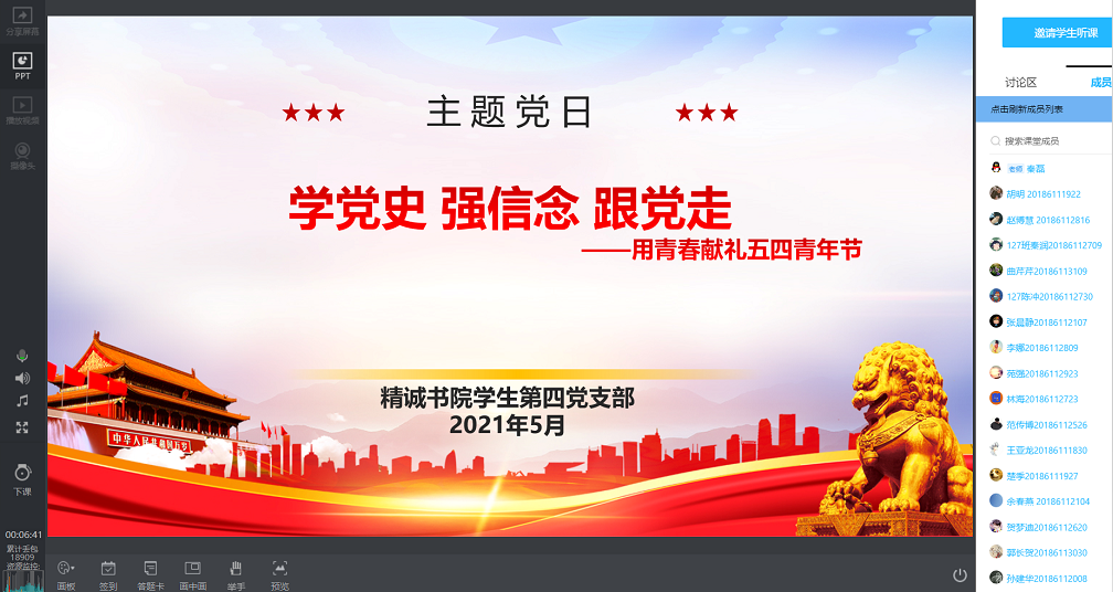 “青春如初春,如朝日,如百卉之萌动。青年之于社会,犹新鲜活泼细胞之在身。”为弘扬和传承“五四精神”,凝聚青春正能量。5月4日,精诚书院学生第四党支部以线上形式开展“学党史,强信念、跟党走---用青春献礼五四青年节”为主题的党日活动。活动由党支部书记秦磊主持。