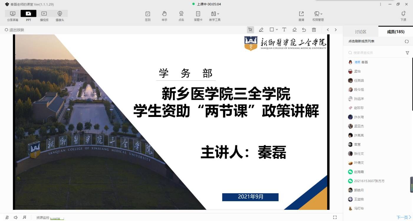 为进一步推进我院资助政策和资助育人宣传工作,加大对学生资助政策宣传力度,确保国家各项资助政策得到更好地贯彻和落实,让新时代的中国梦扎根新一代青年的心中,爱国,知恩,报国。精诚书院特开展2021-2022学年“新乡医学院三全学院学生资助‘两节课’政策讲解”主题班会。