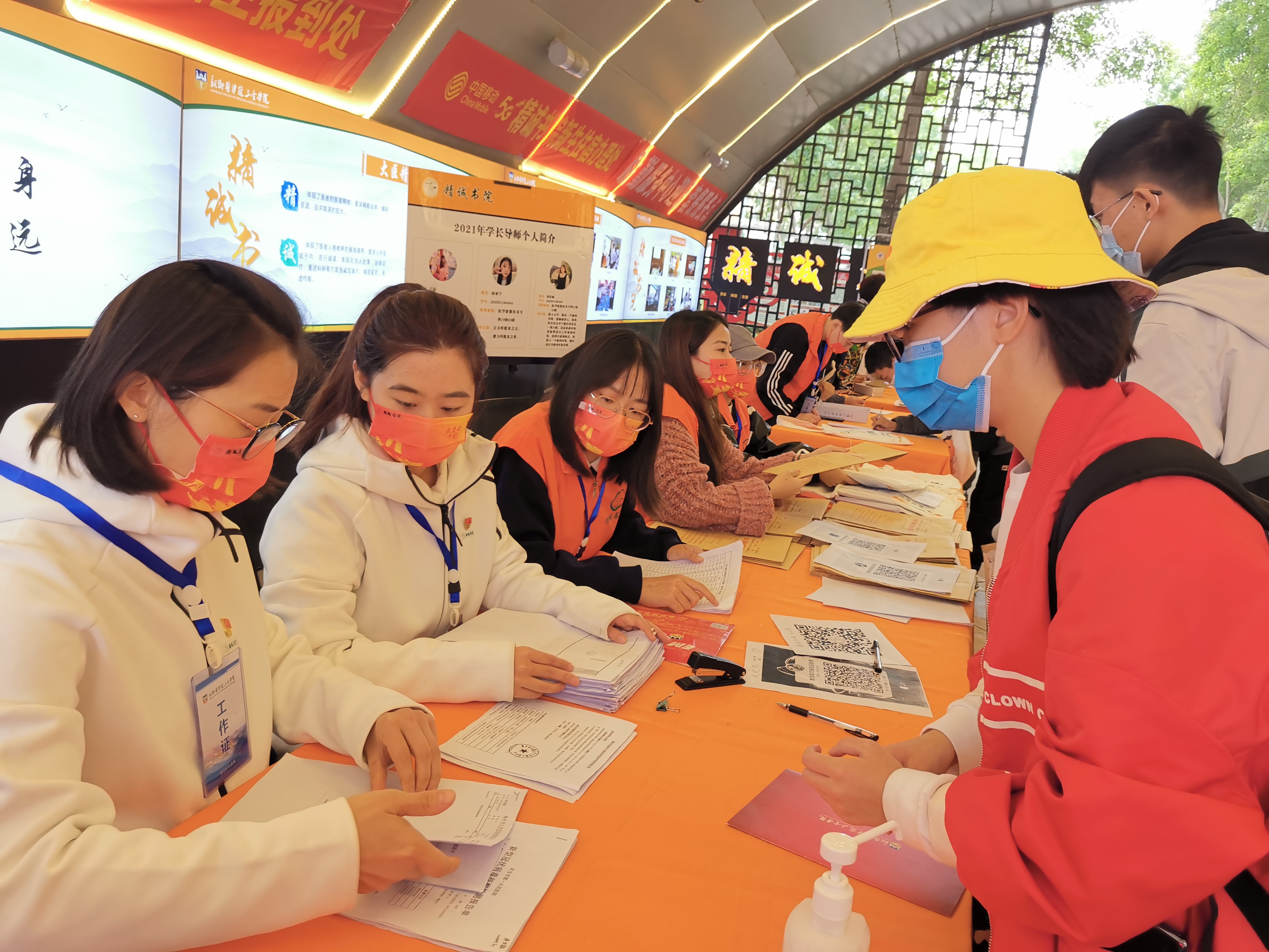 迎新工作过程中,书院随处可见每位志愿者身着橙马甲、佩戴红星爱国口罩。为凸显“抗疫防控与爱国教育”迎新特色,精诚书院定制了“橙”心爱国口罩。五星闪烁与“我爱你中国”相辉映,满满爱国心的口罩贴上了精诚书院logo,让每一个师生志愿者都坚定责任感和使命感,为每一位新生做好入学服务。