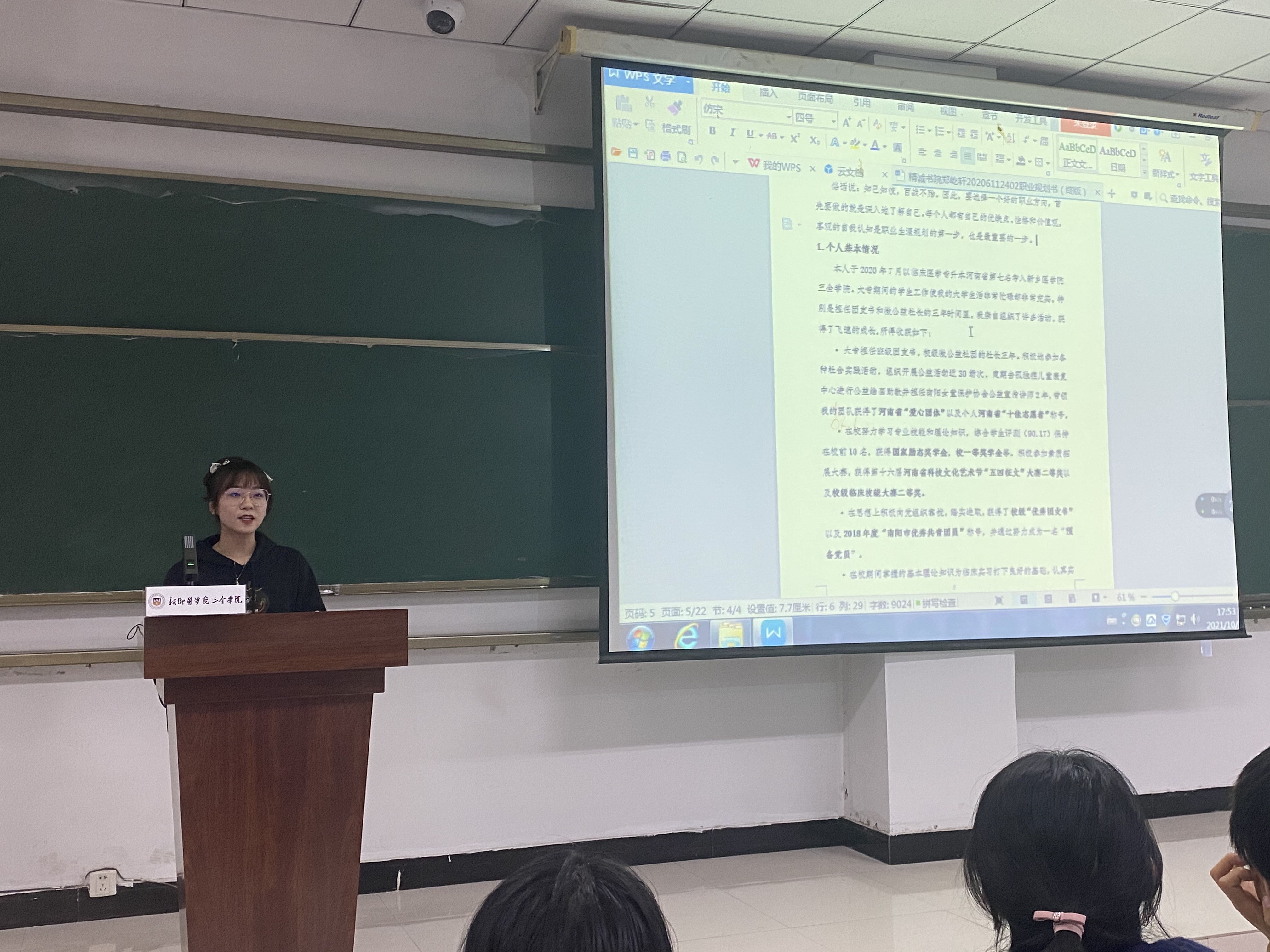 郑屹轩同学将自己的参赛经验为学弟学妹们倾囊相授。首先详细讲解了职业规划书中:自我认知、职业认知、职业决策:计划与路径、评估与调整、职业道德六个方面书写时的注意事项,郑接着又分别从规划书的排版、书写语气、书写格式、语言是否得体、比赛穿着等甚至易忽略的细节部分一一细述,使在座的同学们得到实用且珍贵的建议。最后郑屹轩同学与学弟学妹们分享座右铭:和梦想平等交易,与喧嚣保持距离。同学们给予热烈的掌声。