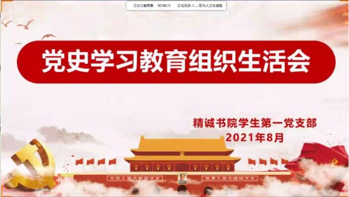 为进一步加强党史学习教育,激励全体党员同志不忘初心牢记使命,引导党员同志学史明理、学史增信、学史崇德、学史力行,从党的百年伟大奋斗历程中汲取继续前进的智慧和力量。8月12日上午,精诚书院学生第一党支部在线上召开党史学习教育专题组织生活会。会议由支部宣传委员段怡婷主持,支部全体党员参加。