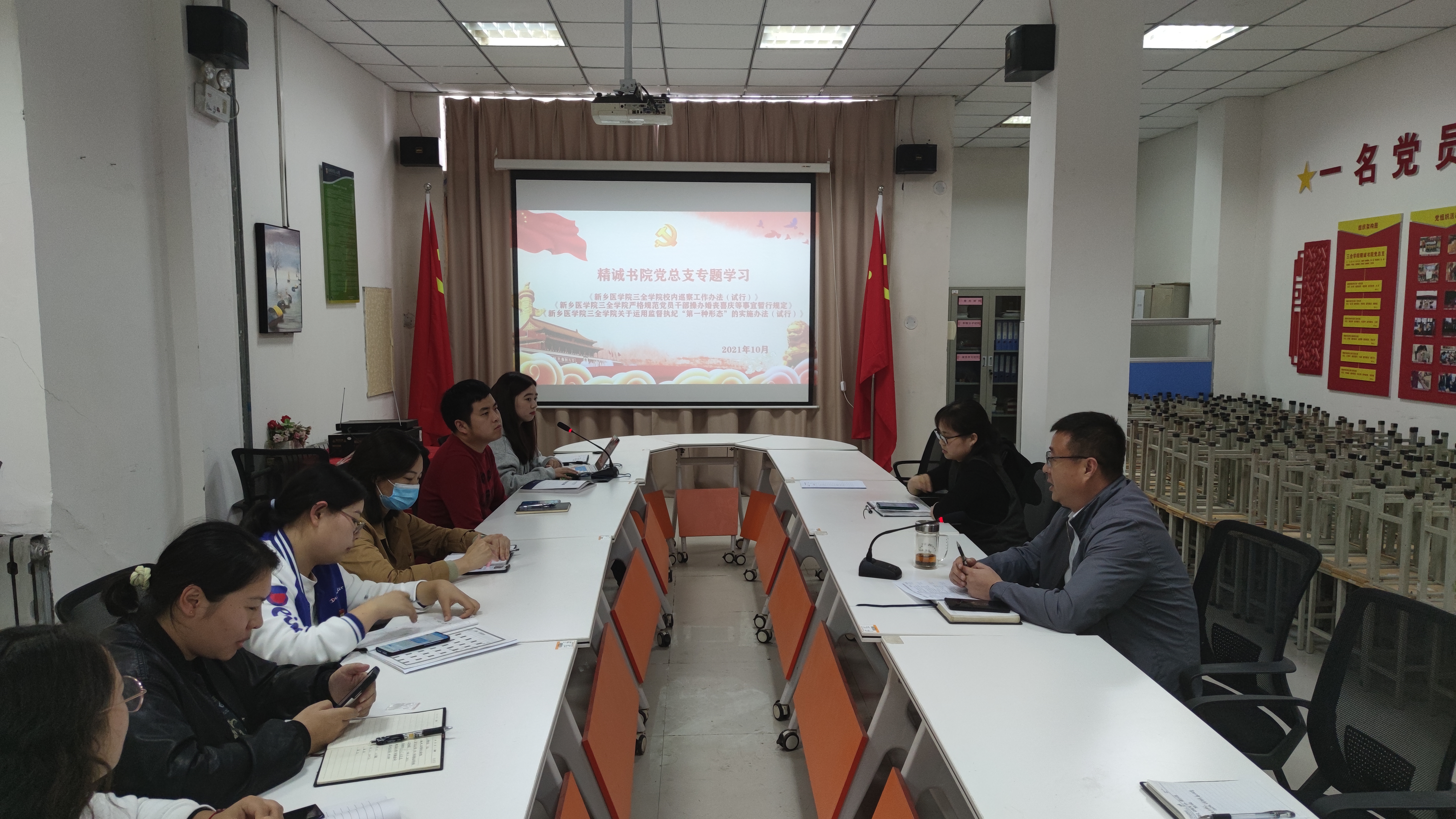 10月15日,精诚书院党总支在党员活动室召开《新乡医学院三全学院校内巡察工作办法(试行)》等文件的学习专题会议,精诚书院全体教职工参加,党总支书记张新主持。