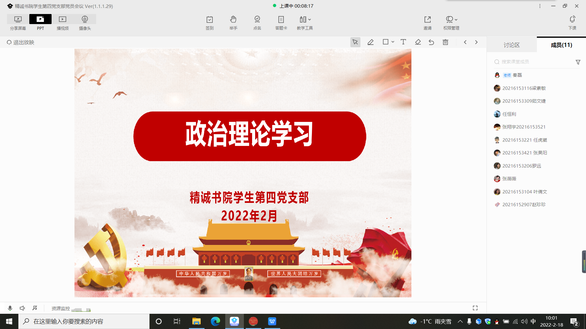 2月19日,精诚书院学生第四党支部于以线上形式召开政治理论学习会议,本次会议由支部书记秦磊同志主持,全体党员参加。