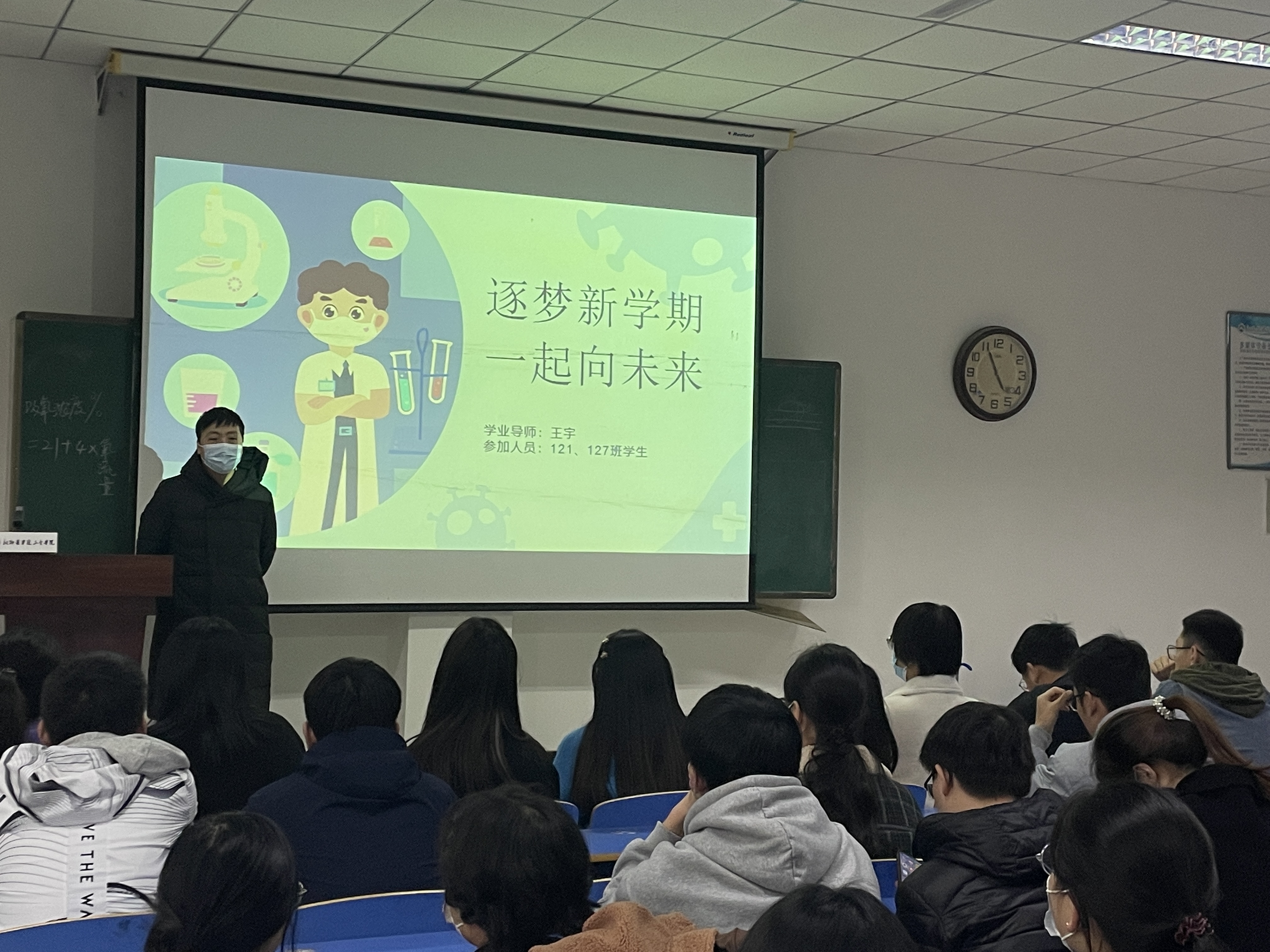 3月14日,王宜珂老师在问学楼301教室,与126班同学们开展了以“逐梦新学期,一起向未来”的主题交流会。首先,王宜珂老师祝贺我们迎来新学期,并告诉同学们新学期在学习上一定不能倦怠,要更加努力。新学期伊始,学校处于疫情防控状态下,王宜柯老师就如何调整心态做了讨论,王老师提醒大家要合理安排好学习与生活,遵守学校对疫情防范的要求,各网格化负责人与同学要精诚合作。同学们要在新学期设立有自己的目标和规划,为了同学们每个人的灿烂未来而努力,一起向未来。最后,王宜柯老师劝导大家要经常进行体育锻炼,强健体魄,在大学期间养成良好的生活和学习习惯,并提醒同学们这样做会对大家终身有益。