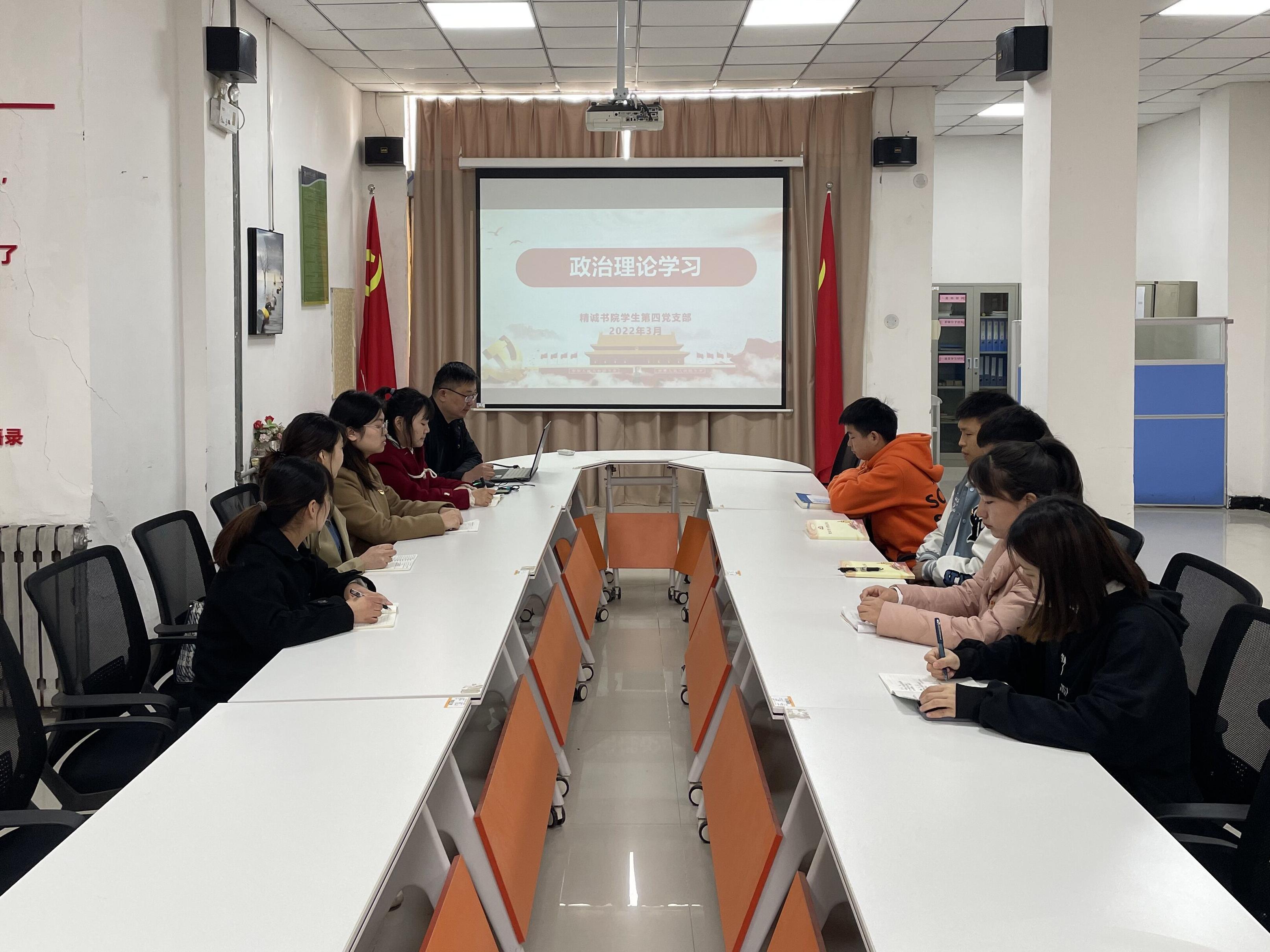 3月15日,精诚书院学生第四党支部在党员会议室召开了三月份政治理论学习会议。本次会议由支部书记秦磊同志主持,全体党员参加。