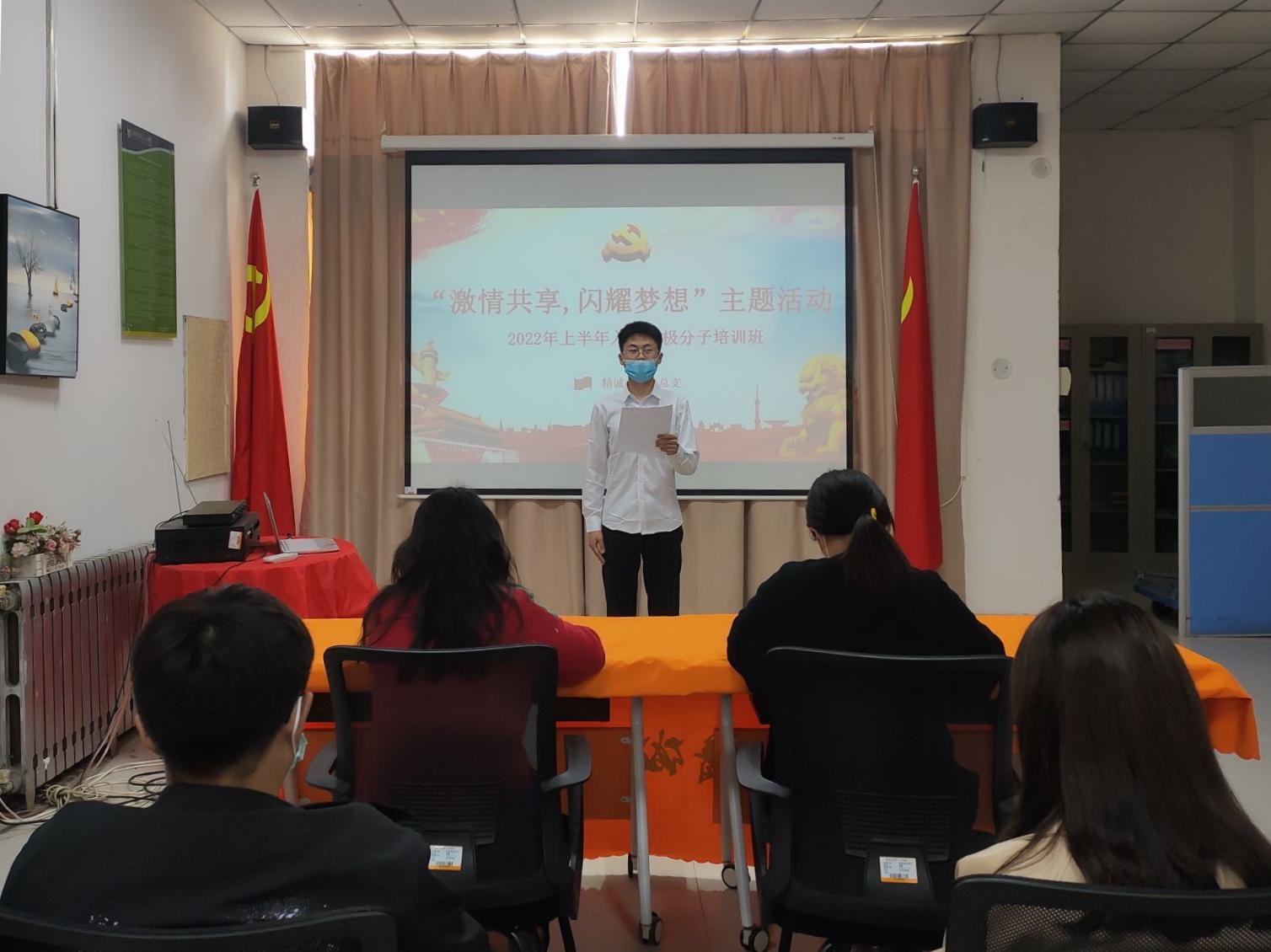 除了丰富的理论宣讲外,党总支按照培训方案组织开展了“激情共享,闪耀梦想”主题演讲朗诵活动。各位学员分享了北京2022年冬奥会、冬残奥会上我国奥运健儿激情拼搏、中国女足亚洲杯夺冠永不服输的故事,激励广大青年学子敢于拼搏、永不服输、永不放弃。通过此次活动,全体学员认识到,身为新时代的青年应努力把青春奋斗融入党和人民事业,不负美好韶华,不负殷切期望,团结向上,拼搏向前,新时代必将因青春光彩绽放而更加瑰丽动人。