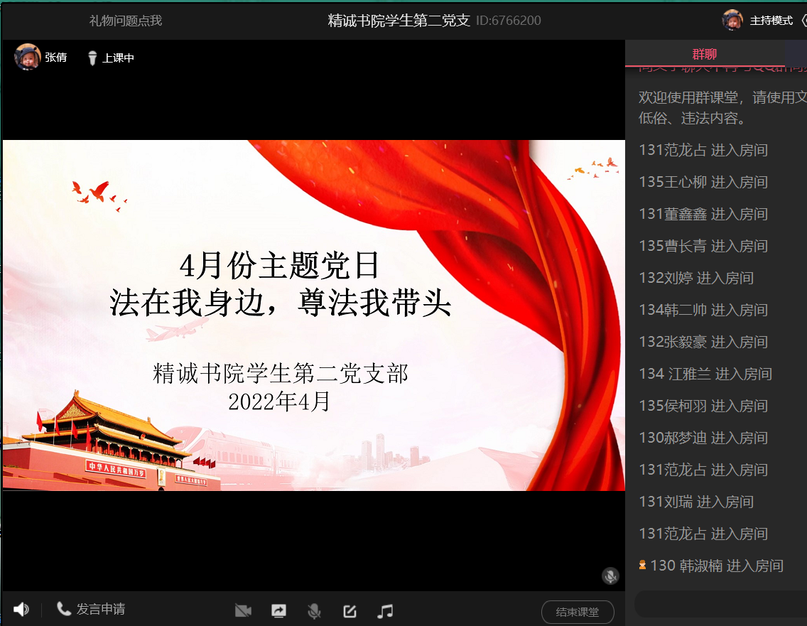 2022年4月18日,精诚书院学生第二党支部书记张倩通过线上会议与全体党员开展了“法在我身边,尊法我带头”主题党日学习。