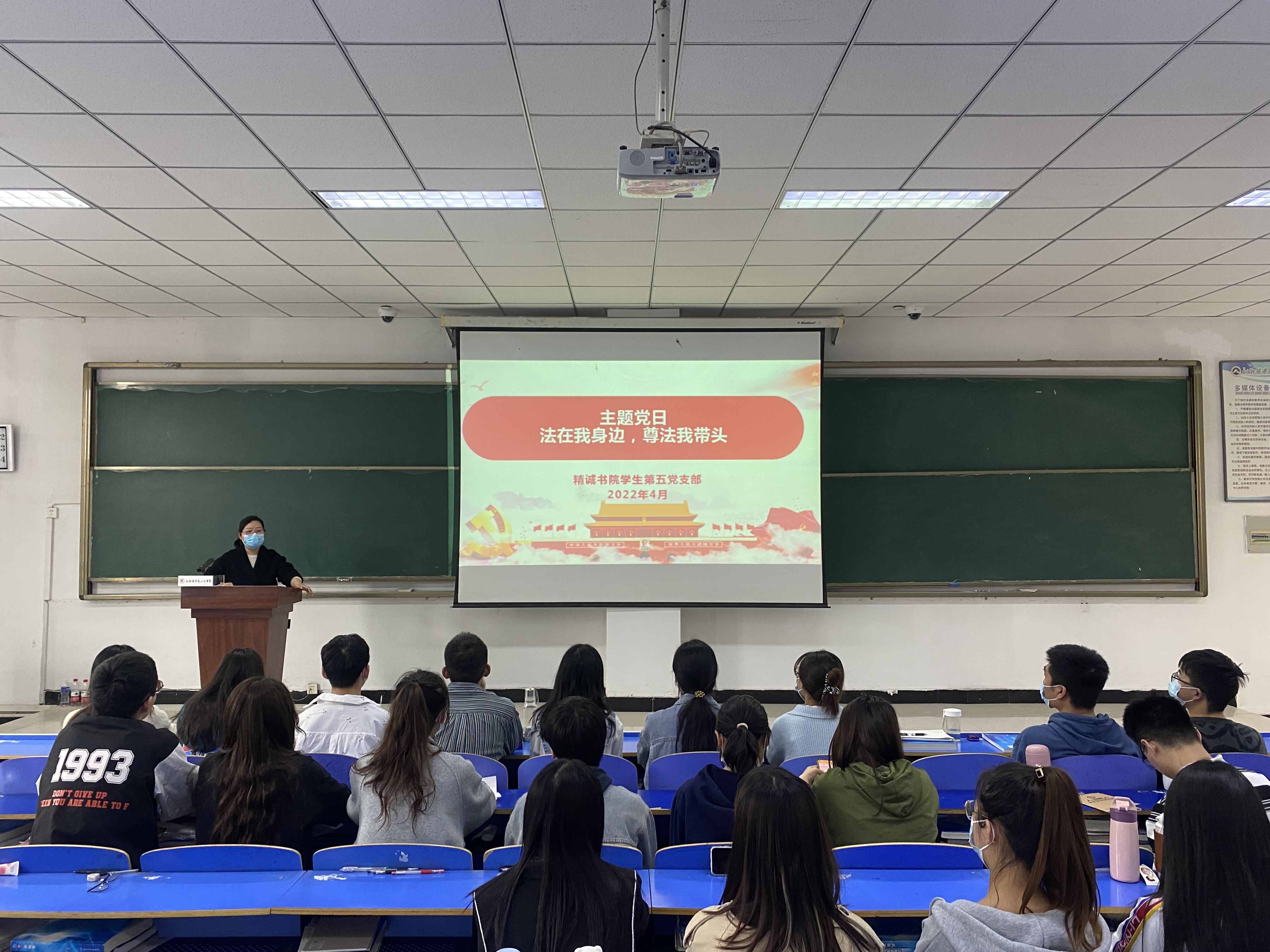 2022年4月19日,新乡医学院三全学院精诚书院学生第五党支部开展“法在我身边,尊法我带头”四月份主题党日活动,会议由支部书记宋晶晶主持,全体师生党员参加。