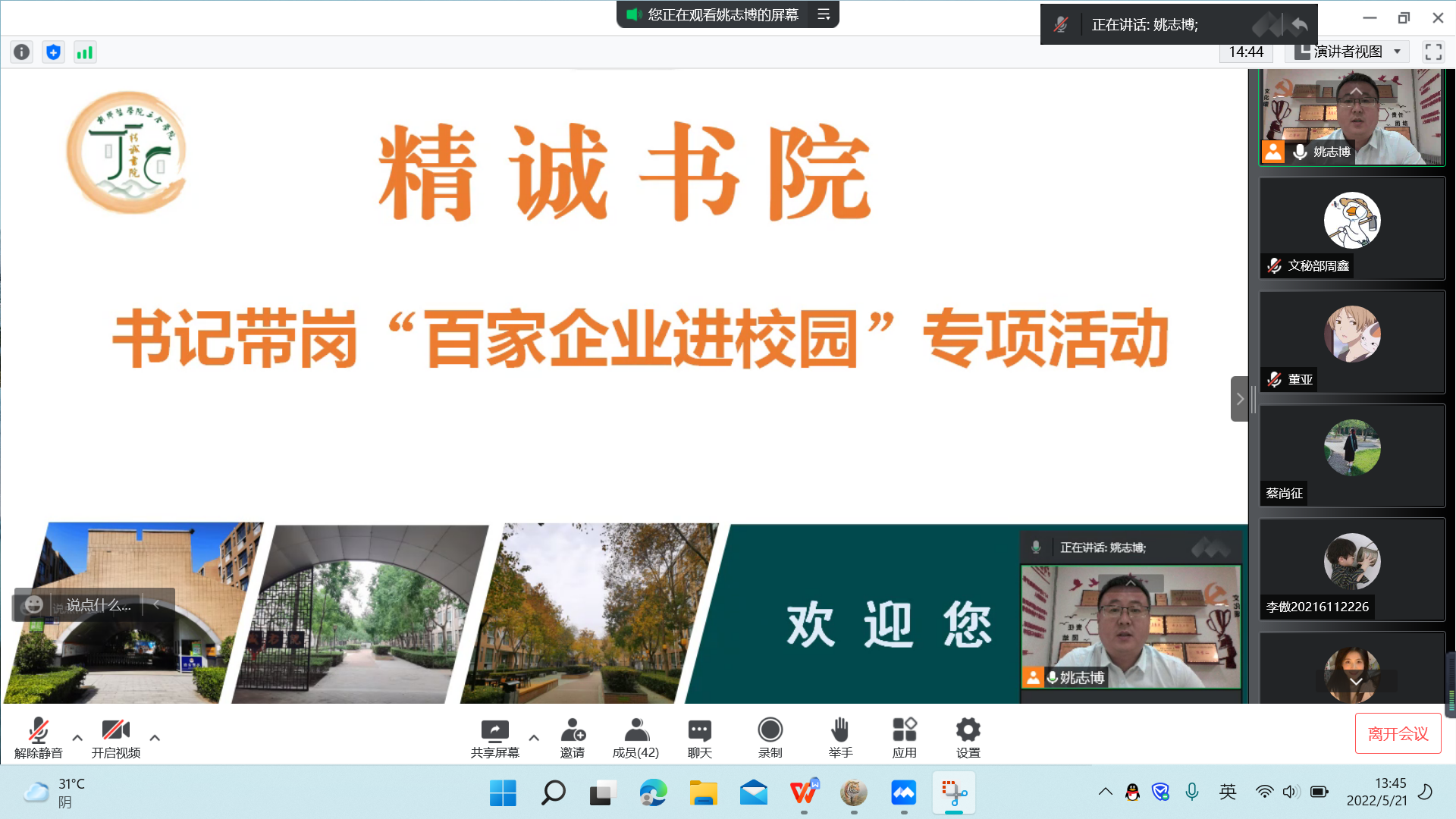 首先,主持人姚志博介绍了本次活动的流程和参与现场宣讲的用人单位和与会领导,对参与本次线上直播宣讲的用人单位表示欢迎。接着,张新书记从书院2022届毕业生整体情况、我校各个专业毕业生的培养定位、培养目标等方面做了详细介绍。最后张新书记说道:“再次感谢各位用人单位在百忙之中来我书院进行线上宣讲,期待精诚书院的莘莘学子们能与各用人单位一起共创事业、共谋发展、共赢未来。同学们,也希望大家积极调整就业择业心态,主动适应当下求职的新形态,实现理想就业。”