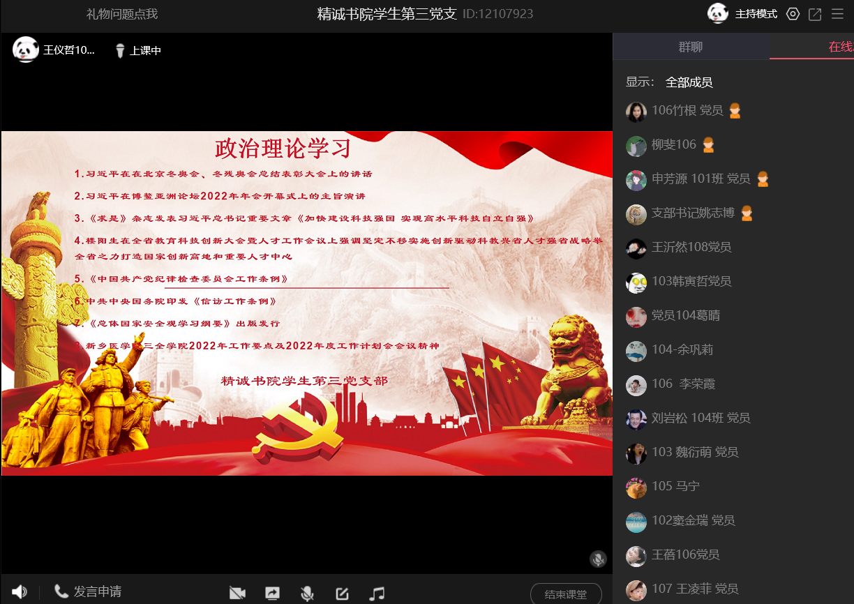 会议开始,姚志博同志带领全体党员共同学习了5月5日,习近平总书记主持召开中共中央政治局常务委员会会议,分析当前新冠,肺炎疫情防控形势,研究部署抓紧抓实疫情防控重点工作并发表重要讲话、学校疫情防控指挥部印发的59号-68号文件;3.《关于全面加强新时代大中小学劳动教育的意见》、《新乡医学院三全学院第一-届劳动教育月活动方案》。随后,学生党员积极交流了学习体会,支部委员王仪哲引用习近平总书记的话说“目前全球疫情仍处于高位,病毒还在不断变异,疫情的最终走向还存在很大不确定性,远没有到可以松口气、歇歇脚的时候。我国是人口大国,老龄人口多,地区发展不平衡,医疗资源总量不足,放松防控势必造成大规模人群感染、出现大量重症和病亡,经济社会发展和人民生命安全、身体健康将受到严重影响。要深刻、完整、全面认识党中央确定的疫情防控方针政策,坚决克服认识不足、准备不足、工作不足等问题,坚决克服轻视、无所谓、自以为是等思想,始终保持清醒头脑,毫不动摇坚持“动态清零”总方针,坚决同一切歪曲、怀疑、否定我国防疫方针政策的言行作斗争。”