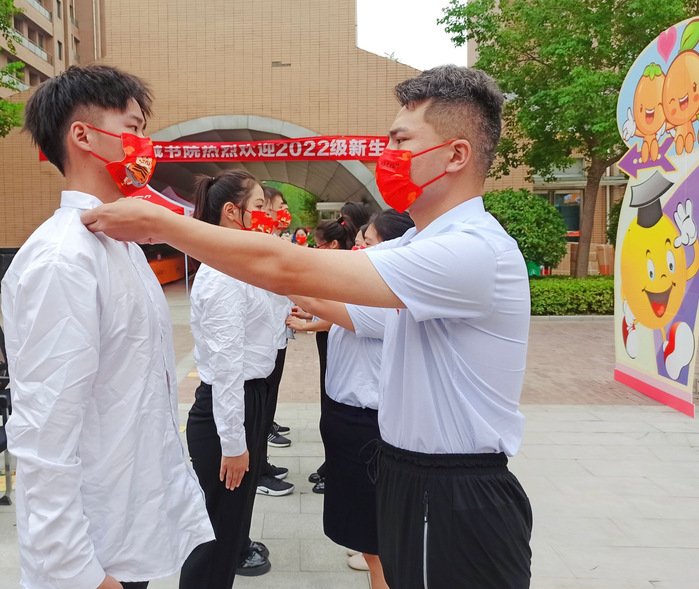 该项由我们的新生辅导员老师为新同学整理衣冠,寓意“童蒙之学,始于衣冠;先正衣冠,后明事理”,展现对自己、对他人的尊重。