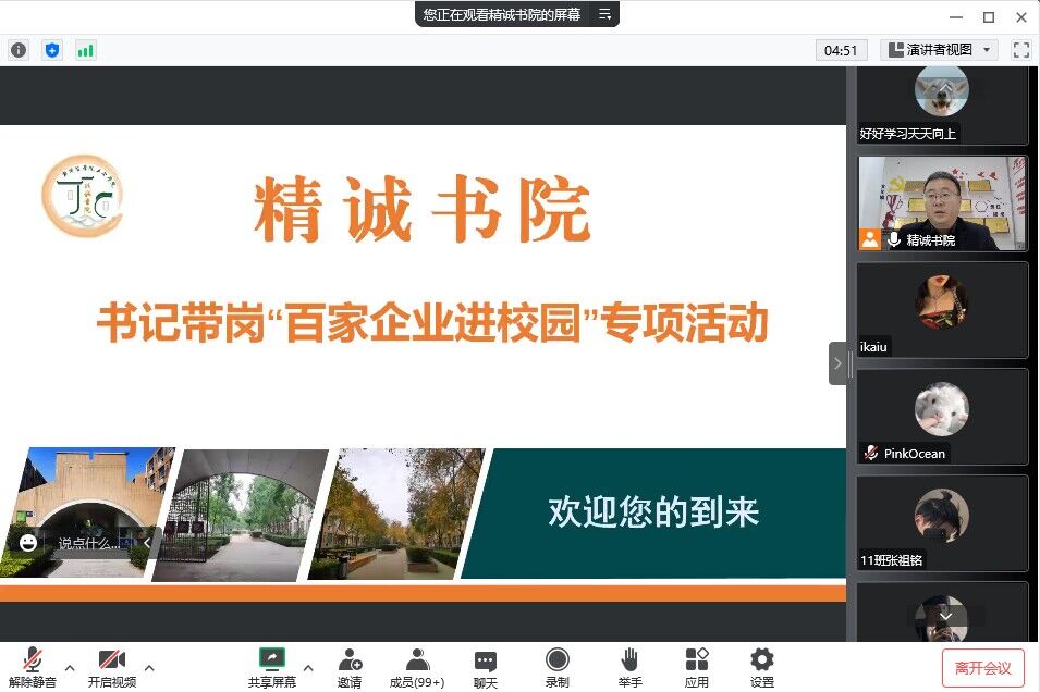 为贯彻落实教育部、省教育厅书记校长访企拓岗促就业专项行动工作要求,多形式开展访企拓岗促就业活动,为毕业生提供更多就业实习岗位支持。精诚书院于10月27日通过腾讯会议开展书记带岗“百家企业进校园”活动,精诚书院党总支书记张新担任本届毕业生的“代言人”和“推荐官”。