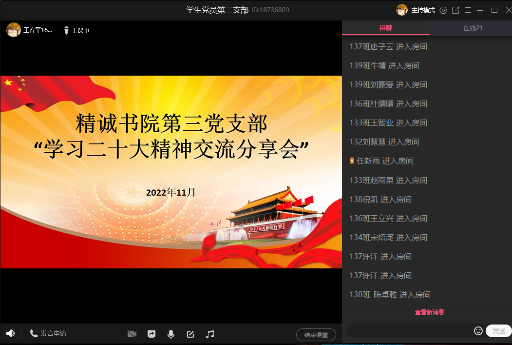 为进一步学习贯彻党的二十大精神,11月11日,精诚书院第三党支部在线上召开学习交流分享会,会议由支部书记王春平主持,支部全体学生党员参会。