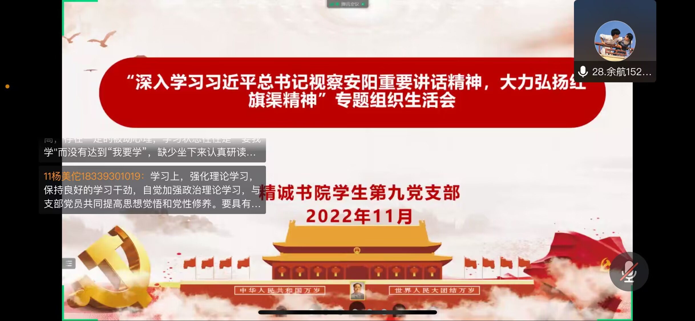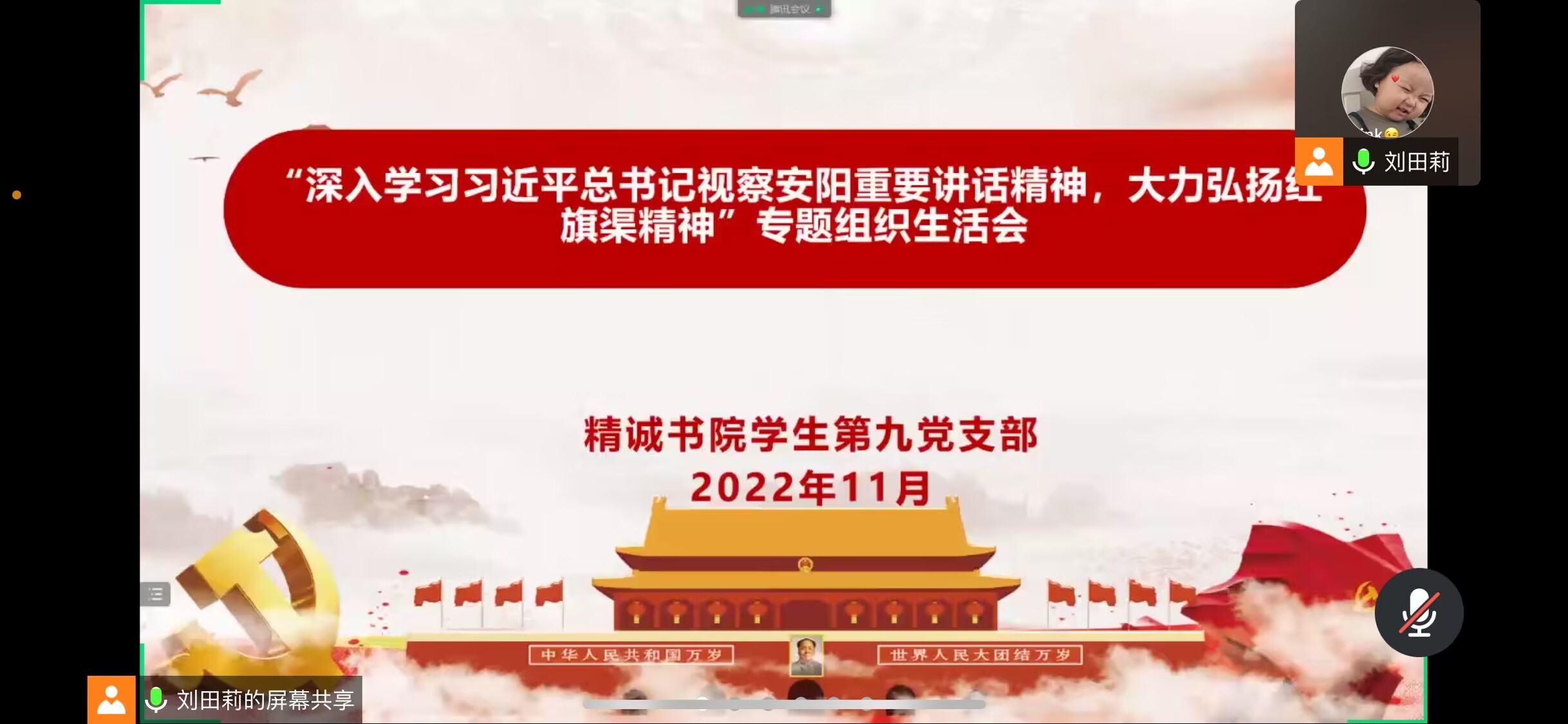 11月23日,精诚书院学生第九党支部在线上召开了以“深入学习习近平总书记视察安阳重要讲话精神,大力弘扬红旗渠精神”为主题召开专题组织生活会。本次会议由支部书记刘田莉同志主持,全体党员参加。