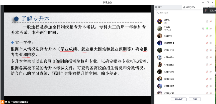 2022年11月11日下午9-10节,王晓娜老师在腾讯会议上组织开展了“专升本学业规划”主题活动,会议对象为22级智能医疗装备技术9-12班全体同学。王晓娜从“专升本的重要意义”、“考试内容”、“录取规则”以及“未来发展”等几个方面帮助同学们进一步认识到专转本是拓宽就业渠道和提升学历的重要途径,激发了同学们的学习的斗志和决心!