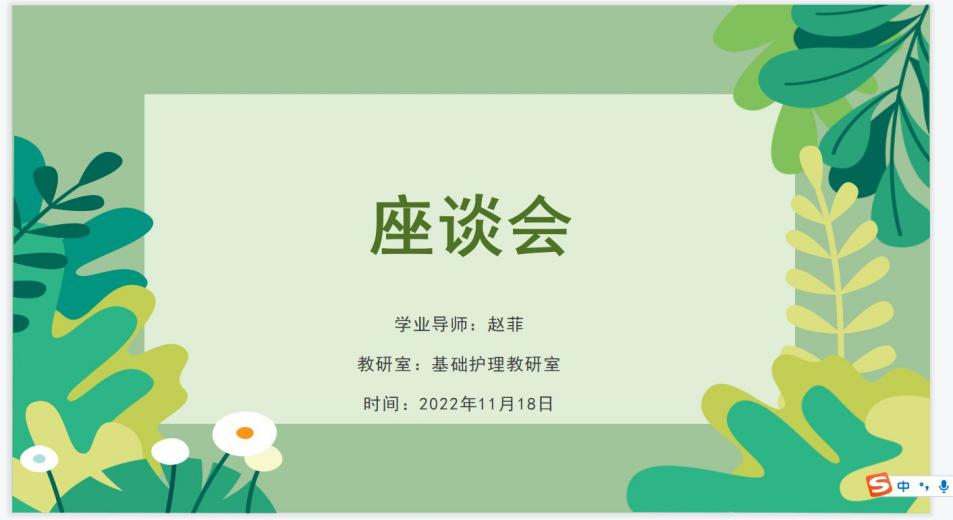 11月18日,赵菲老师带领2022护理学205-207班学生开展了线上学业导师活动。首先,赵菲老师指出,疫情期间部分线下课程转化为线上课程,教室转换为宿舍,是学习地点及学习方式发生的变化,但是学习的初心不应该发生改变,鼓励同学们要改变思想,加强线上期间的学习,提高学习效率。