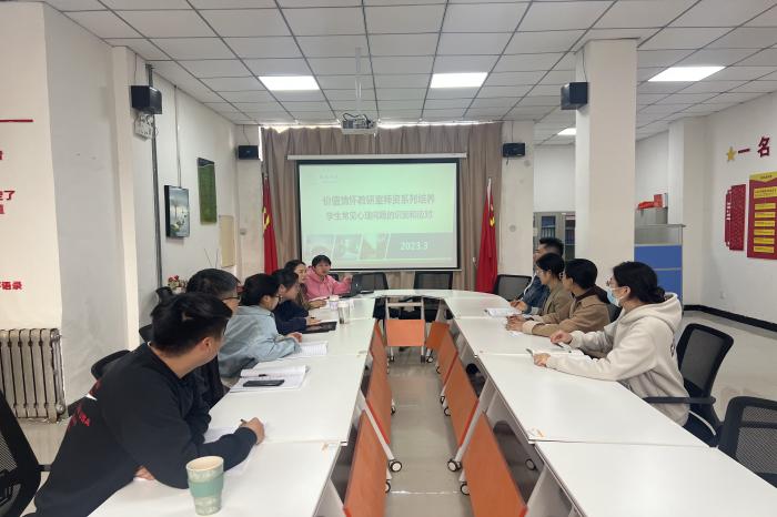 胡静静首先结合前期学期初心理问卷调查及心理工作经验,从学生安全注意事项、重点排查对象、关注渠道、建立动态反馈机制等方面,对开学初心理危机排查的重点注意事项进行了强调;随后,结合实践中的具体案例,对心理危机排查工作中谈心谈话注意事项、一级心理预警学生的注意事项等方面内容进行了详细的介绍。最后,胡静静与各辅导员就带班工作中学生心理问题进行了深入交流,并结合专业的心理学知识,进行了细致指导。