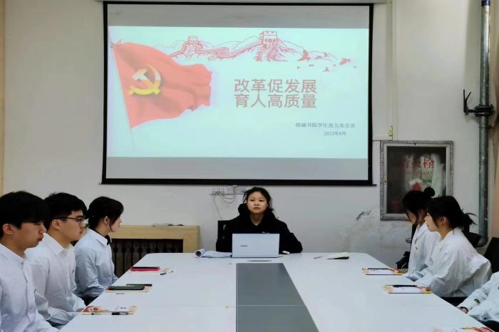 为了深入学习贯彻习近平总书记在党的二十大报告中指出的“高质量发展是全面建设社会主义现代化国家的首要任务”,4月23日,精诚书院学生第九党支部在党员活动室开展以“改革促发展,育人高质量”为主题的主题党日活动,学生第九党支部书记刘田莉主持,全体党员参加。