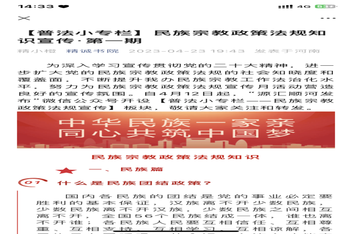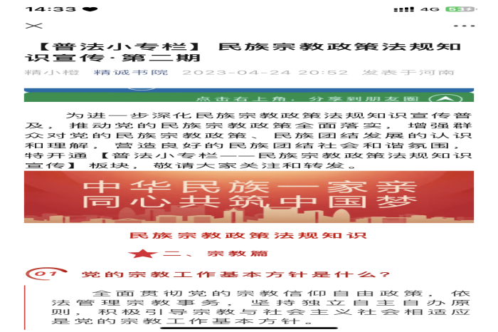 为进一步深化党的民族宗教方针政策学习教育,牢牢把握做好民族宗教工作的正确方向,日前,精诚书院党总支通过集体学习研讨、学生座谈会、主题班会、新媒体宣传等多种形式,分层次、有重点、分阶段地开展民族宗教政策法规宣传月活动。