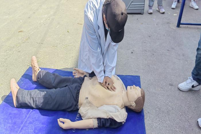 活动伊始,志愿者们热情、耐心的为村民测量血压,并宣讲生活健康知识、饮食安全等相关医疗常识,前来咨询和检查的居民络绎不绝。随后,志愿者们借助人体模型演示了心肺复苏的具体流程,使村民掌握心肺复苏的动作要领。