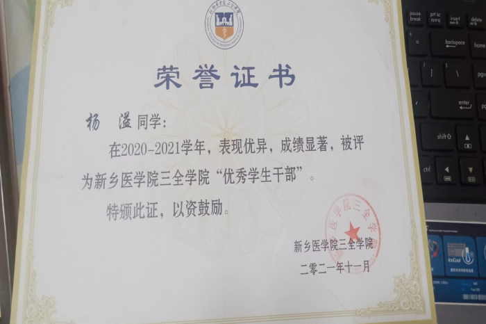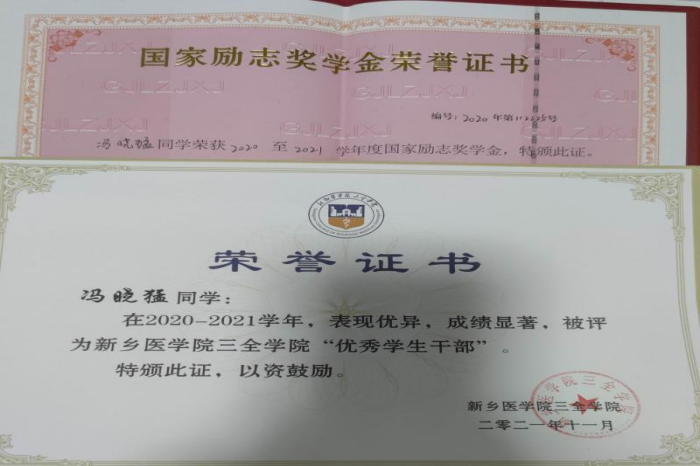 获得荣誉:国家励志奖学金、优秀学生干部等