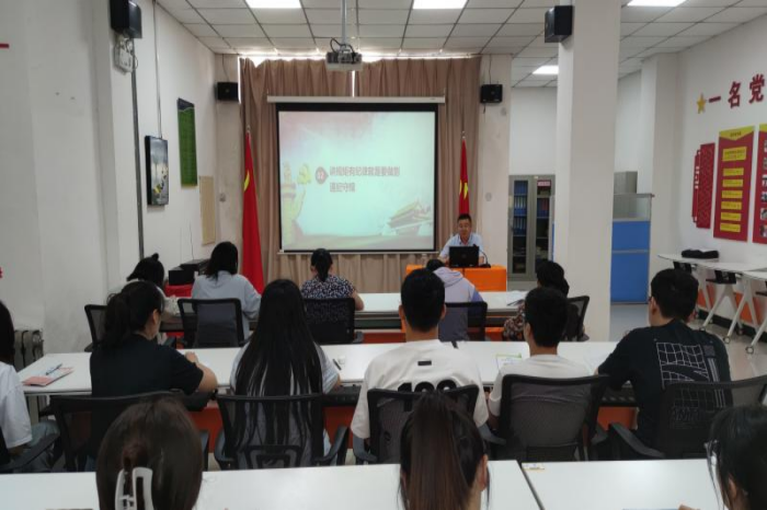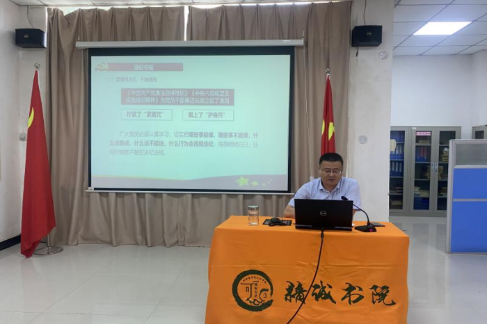 为加强师生纪法知识学习,增强师生诚实守法和廉洁自律意识,推进清廉校园廉政建设,认真落实中共中央办公厅《关于加强新时代廉洁文化建设的意见》要求,根据《关于组织开展党总支(直属党支部)书记讲纪法的活动通知》工作部署,6月19日,精诚书院党总支在党员活动室开展“讲纪法、守规矩”专题党课。党课由精诚书院党总支书记张新讲授,书院全体教职工和学生党员代表参加。