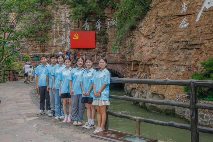 游学团一步一个脚印沿渠徒步3公里,从大山之中穿越而过并在沿渠途中拍摄红旗渠的地域风貌;用脚丈量、用眼发现、用心体会,重温峥嵘岁月。游学成员沿张家领、创业洞、团结洞、一线天、玉皇顶、青年洞路线,领略测量渠线、修渠英雄雕像、劈开太行山等修渠遗迹,这些悬挂在太行悬崖绝壁上的红旗渠让游学团成员倍感震撼。在红旗渠总干渠的咽喉工程青年洞处,成员们追忆当年“十年青年十万兵,峭壁之上粗绳捆,一手持纤一手锤,凿穿悬崖得沟渠”的开凿场面,真切感受红旗渠工程的伟大与艰辛,切实领略到青年的使命和担当。