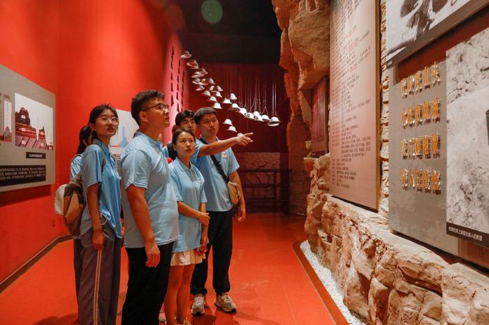 游学团队来到红旗渠红色教育基地风景区。首先,游学团来到渠上文旅,由渠上文旅负责人吴东泽为大家做以“青春寻访红旗渠,感悟红色印记”为主体的先导讲座,以导促学,以践促学。随后,游学团在红旗渠纪念馆参观学习,从一张张珍贵的历史图文资料、一件件锈迹斑斑的文物到一个个还原工程全貌的沙盘模型,游学团成员仔细学习、认真记录,感受当年林州人民为改变恶劣的缺水条件,干部身先士卒,群众团结一心,手拿凿具开山修渠,不畏艰难、艰苦奋斗的精神。最后,游学团成员在馆内进行了诗歌朗诵,以“诵”的形式来表达对红旗渠建设者的敬畏之情,同时也深刻感悟到习近平总书记视察红旗渠时重要讲话精神的深刻内涵。