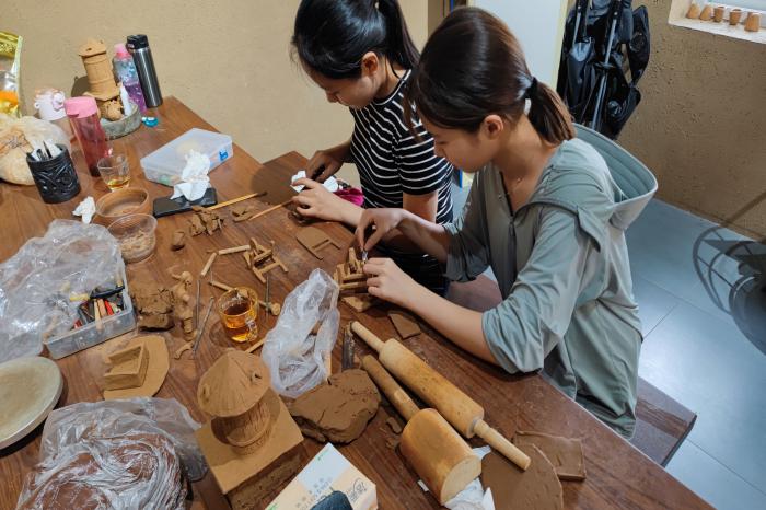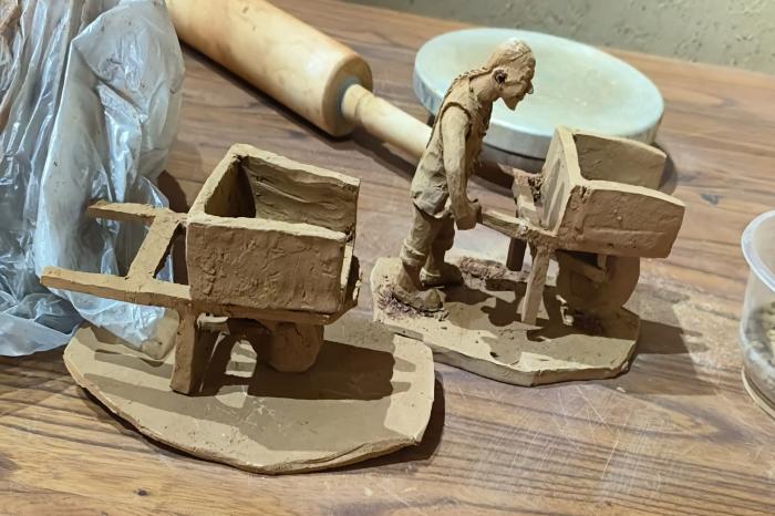 随后,实践队伍在参观过博物馆后在当地参加了手工活动,自己动手用木头和粘土制作陶瓷和工艺品。在手工制作的过程中,李佳蓉和牛乐然用手细心的捏制人偶、动物、场景等。制作完成后,李佳蓉说:“小小的一件陶艺,却倾注了制作者所有的心血,看似简单的外表下,每一步的拉坯、塑性都极其考验制作人的耐心、细心,只有追求每一处细节完美的人才能做出最出色的陶艺作品。”李佳蓉和牛乐然同学联手制作一个人民推着小推车的陶艺制品,其原型是仿自博物馆中的小推车。这件陶制品的制作意在记录人民之前使用小推车运输的生活方式以及歌颂人民的艰苦奋斗、坚忍不拔的精神。