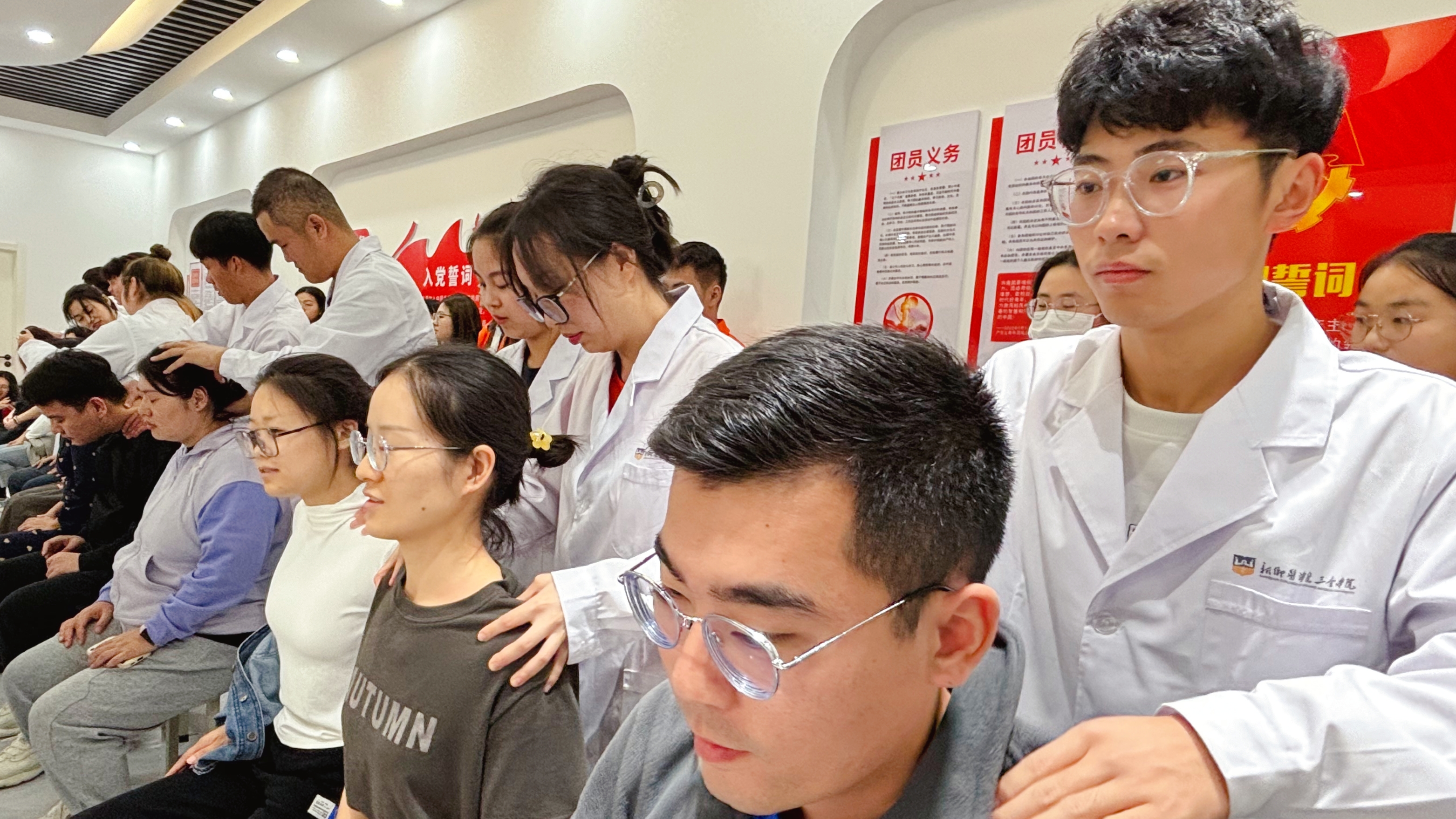 随后,志愿者将理论知识运用到实际操作中,为在场的老师和同学们进行推拿服务。他们手法熟练、动作精准。在问诊、推拿过程中,志愿者们结合所学的soap问诊、肌肉骨骼康复技术、推拿技术为师生进行服务,受到在场师生的一致好评,进一步激发了志愿者们学好专业技术的动力。