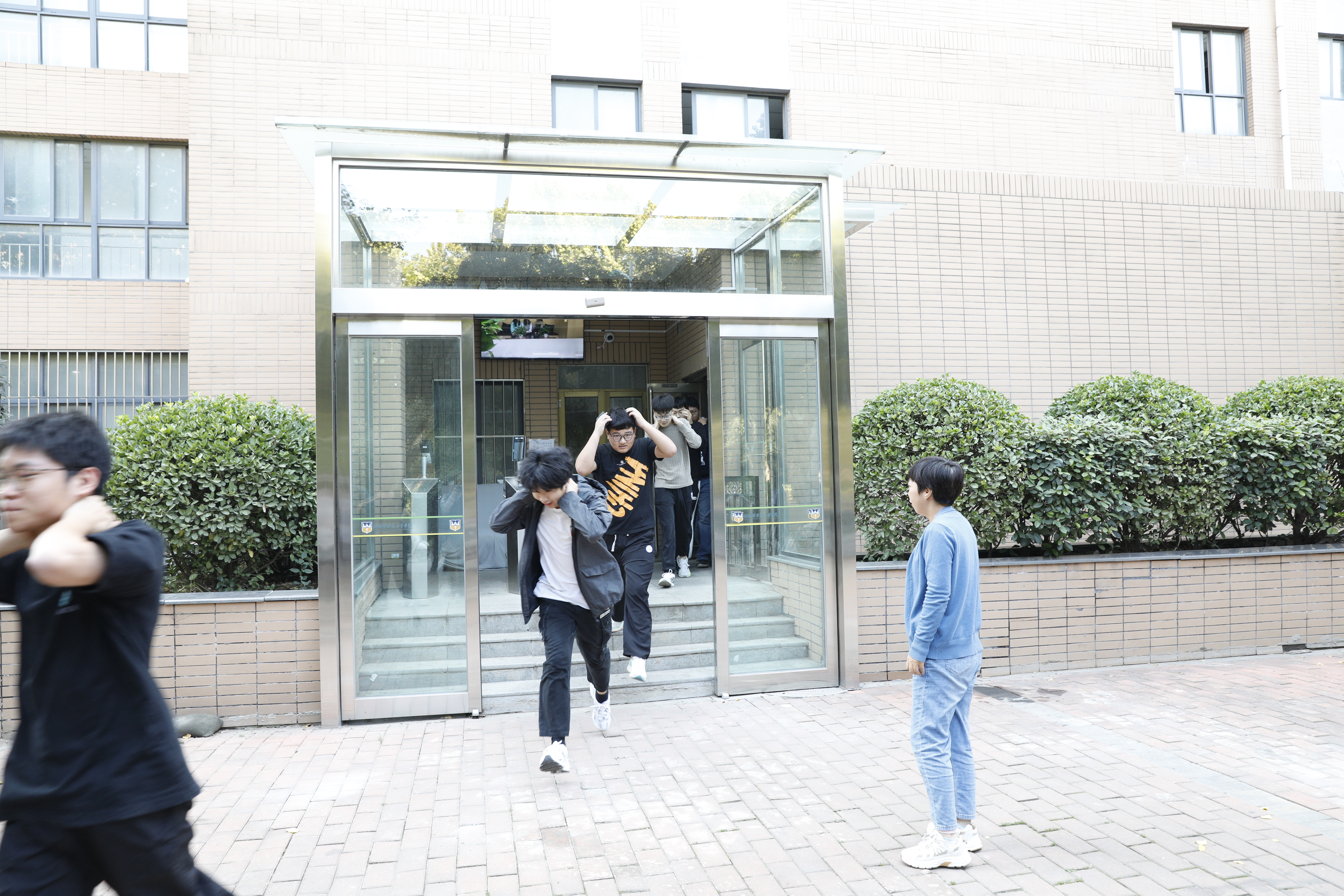 12:30,避险警报骤然响起,张新宣布:精诚书院开展宿舍防震应急疏散演练现在开始。随后,负责各区域辅导员和生活老师迅速到达指定位置,各宿舍学生们在老师指挥下按要求护住头颈部,躲避在小开间内承重墙的墙根、墙角床旁边或下面,寻找障碍物进行紧急避险。10秒钟后快速离开宿舍,弯腰、护头,有秩序地按指定路线向集结地撤离。学生到达集中地点后,以宿舍为单位集合,各宿舍长立即清点汇报人数,老师们确认学生人数和学生情况后上报情况。