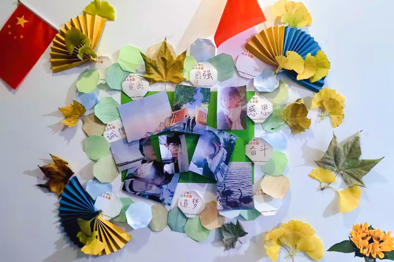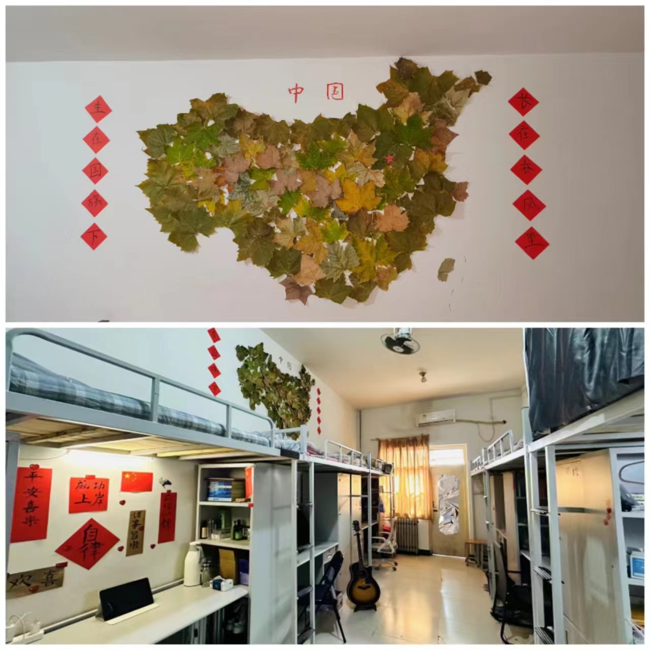 宿舍简介:这是一幅由枫叶组成的祖国山河地图,金黄的枫叶点缀首都,溢满神州大地,每一片象征我们的每一寸国土,紧密相连,层林尽染间,如赤橙的染料泼洒在连绵山川,我们热爱自己的国家,热爱脚下的土地。选择枫叶作为地图也寓意希望国家大好河山能够万寿无疆,永不分离。