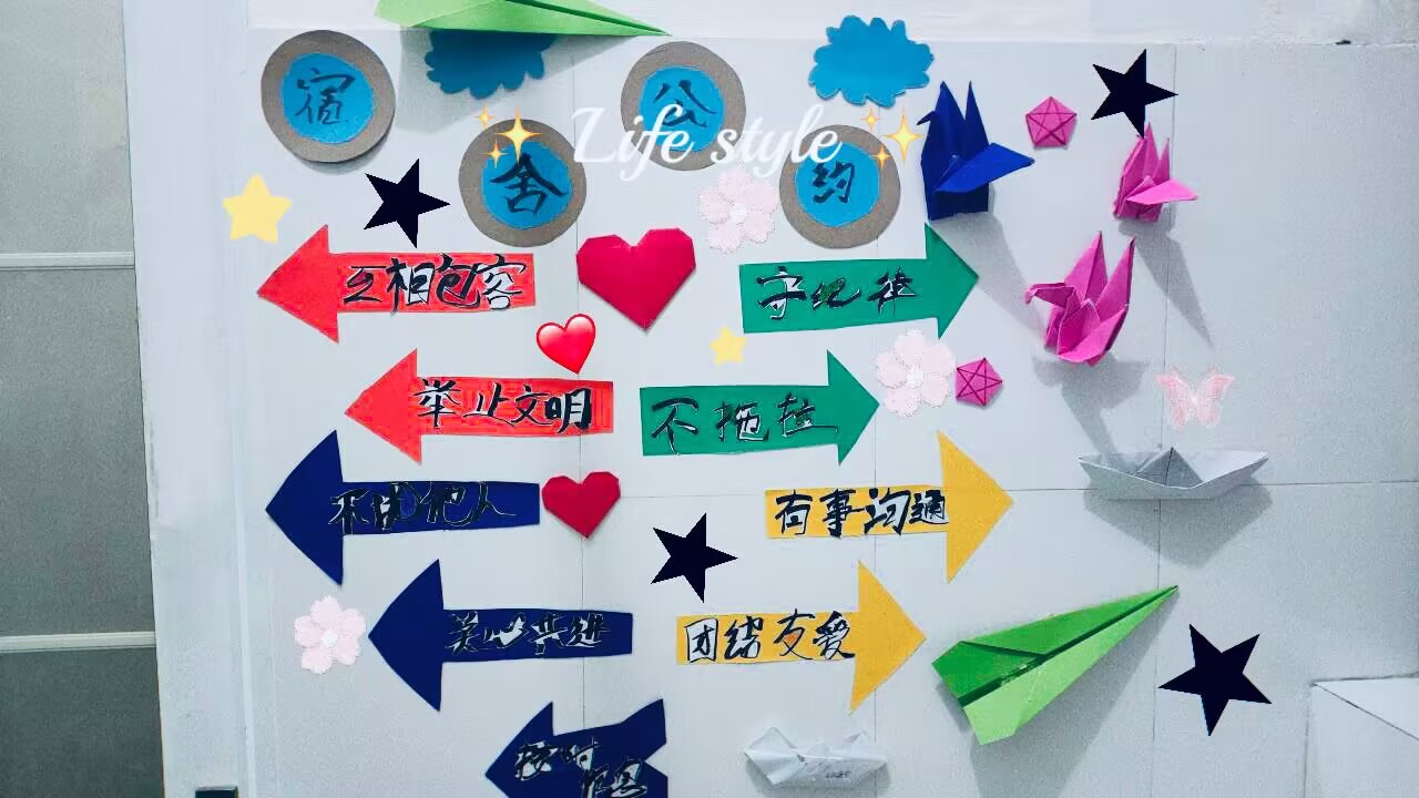 宿舍简介:无规矩不成方圆,我寝文化墙由四条宿舍公约(1、进出随手关门2、熄灯后保持安静3、按时打扫卫生4、有事积极沟通)、一条宿舍标语(踔厉奋进,笃行不息--梦之家)组成。这四条标语是为了增强我们的凝聚力而作。寝室是我们六个人第一次相遇的地方,我们来自全国各地,有幸相遇相知,一起陪伴与成长!寝室是独属于我们的小家,我们未采取夸张的粉饰,用最简单日常的设施,将寝室营造出和谐融洽的氛围。一往“寝”深,“宿”说青春,我们会一直砥砺前行,共同逐梦。