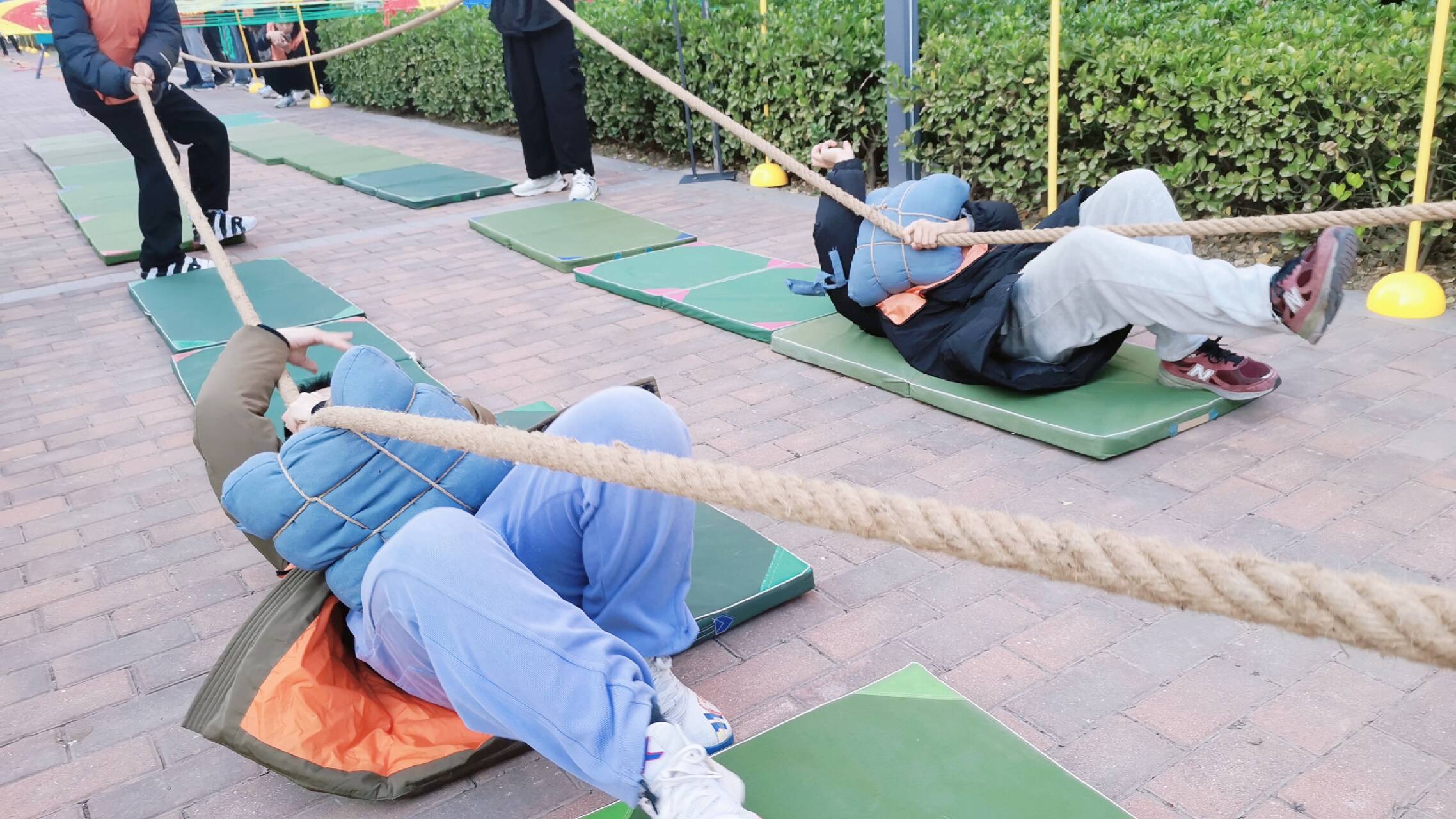 活动中,参与活动的宿舍成员在象征“瑞金”的起点处,两位成员将绳子微微举起,一位成员背负“炸药包”顺着绳子向前爬行,进行“翻山越岭”,到达“泸定桥”的地点,另一位成员接过“炸药包”继续匍匐前进,越过象征“赤水河”用“地雷”摆设的雷区障碍后,依次跳马飞跃前进,虽然途中因为失误而摔倒,但大家都没有放弃,而是继续站起来向着前方奔去,采取跳绳五次越过“雪山”,最后,成功突围,投掷“炸药包”,击破敌军碉堡,到达最后象征“会宁”的终点。