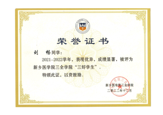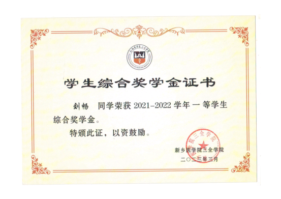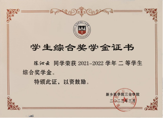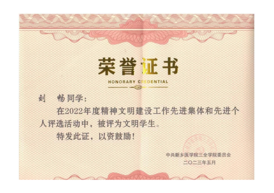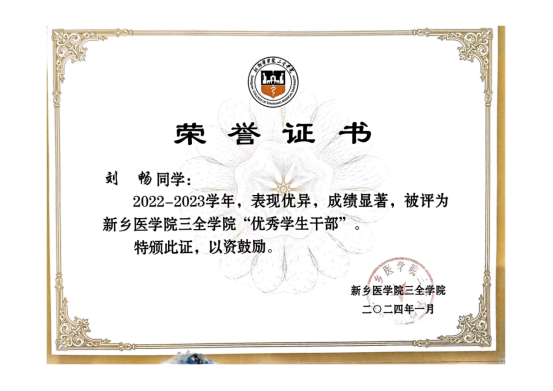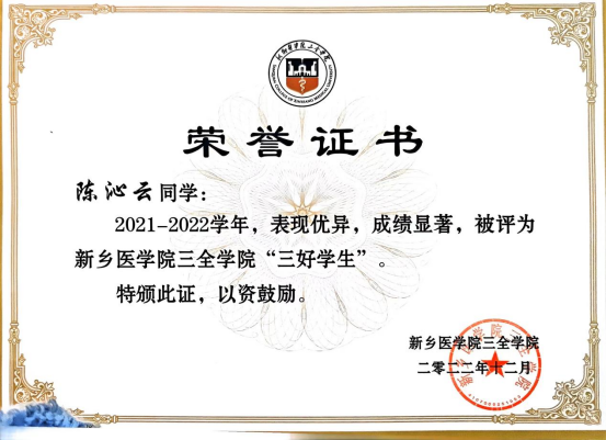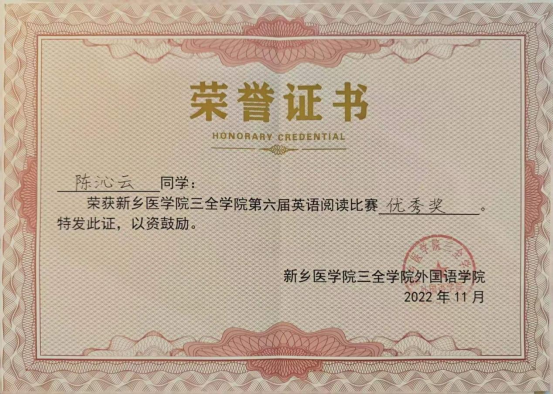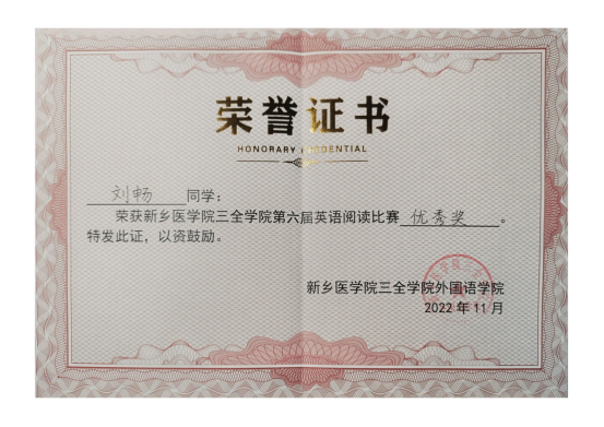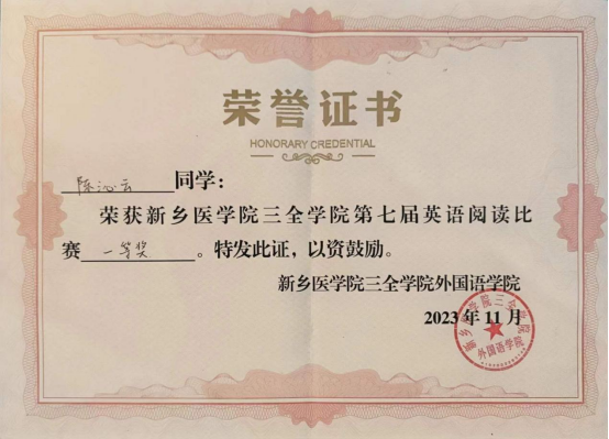 荣获校级荣誉9次:2022年“外研社·国才杯” 写作大赛校级二等奖、2022年“外研社·国才杯” 阅读大赛校级一等奖、2022年校级三好学生、2023年校级文明学生、2023年校一等综合奖学金、2023年校级文明宿舍、2023年校级文明班级、2023年五好红旗团支部、2022年英语六级证书)