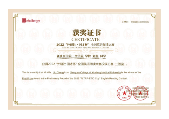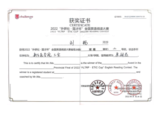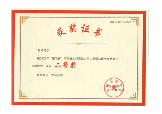荣获省级荣誉4次:2022年“讯飞杯”英语口语大赛省级二等奖;2022年“外研社·国才杯” 全国英语阅读大赛省级二等奖;2023年“第十届全省大学生中国特色社会主义民族宗教理论知识网络答题”省级优秀奖;2023年“全国大学生英语竞赛”省级一等奖;
