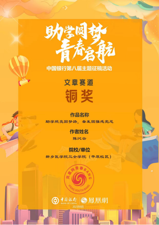 国家级1项:2023 年“助学圆梦 ,青春启航”助学征文文章赛道铜奖;