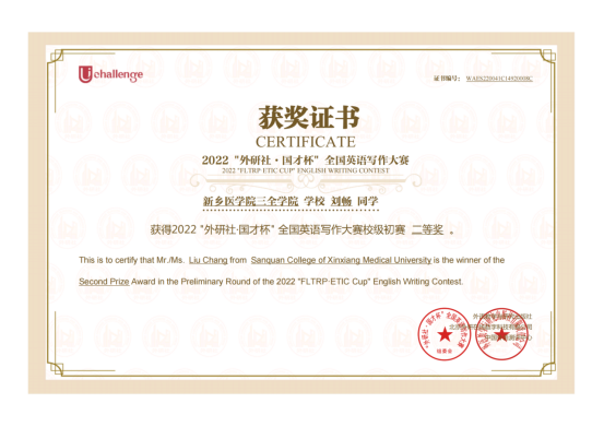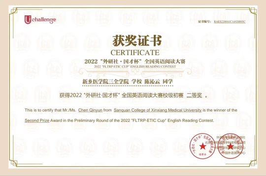 校级9项:2022 年“三好学生”;2022 年“外研社 · 国才杯全国英语阅读大赛”二等奖;2022 年“优秀学生综合奖学金”二等奖;2022 年“外研社 · 国才杯全国英语写作大赛”优秀奖;2022 年“互联网+”大赛获得 一等奖;2022 年“挑战杯”大赛获得 二等奖;2023 年“优秀班干部”;2023 年“优秀学生综合奖学金”二等奖;2023 年“外研社 · 国才杯全国英语阅读大赛”一等奖。
