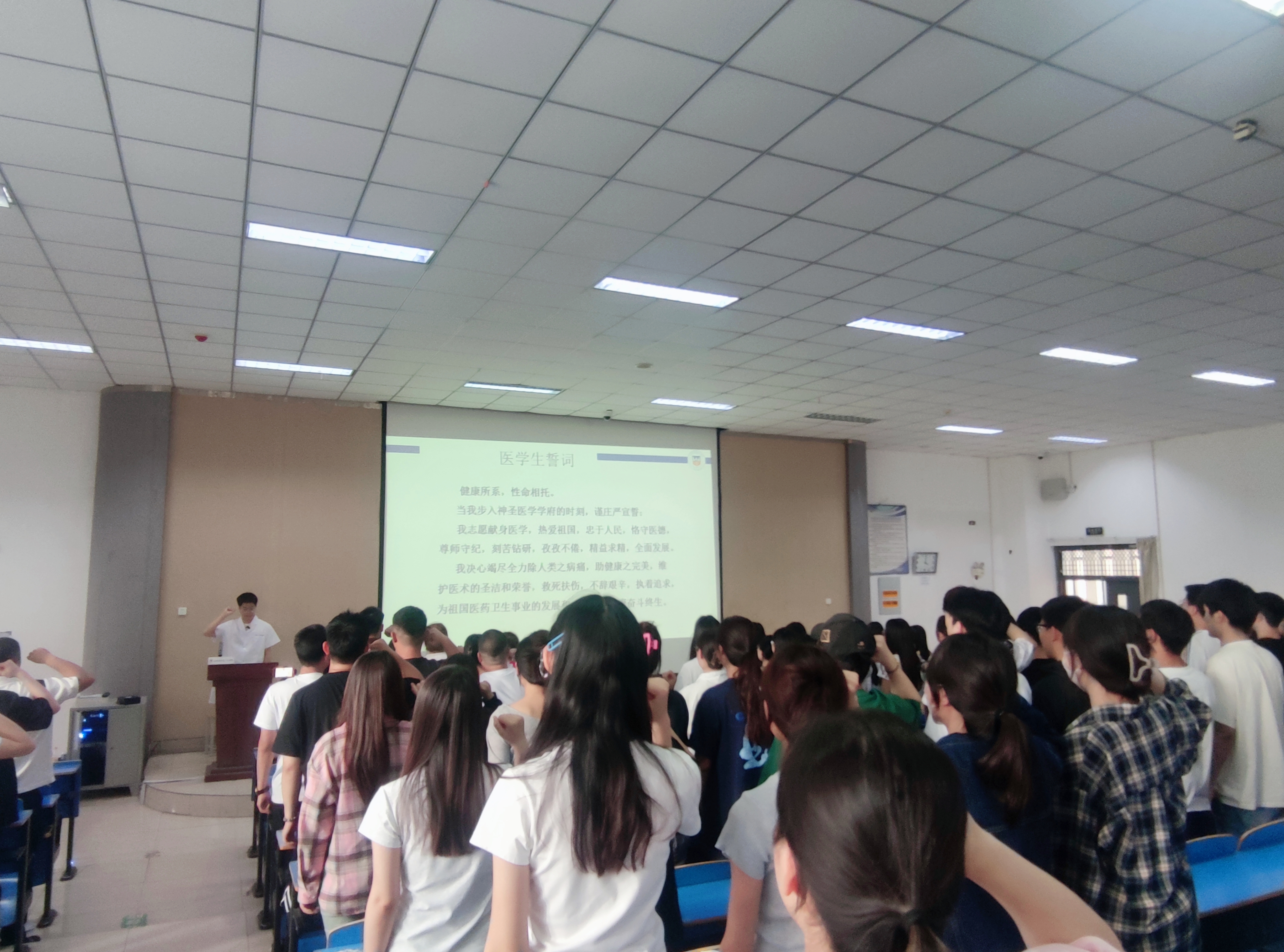 优秀实习学生代表贾子昂,带领同学们重温医学生誓言:“我志愿献身医学,热爱祖国,忠于人民,恪守医德......为祖国医药卫生事业的发展和人类身心健康奋斗终生。”庄严的誓言,不仅是医学生职业精神的象征,也是他们即将开始实习生活的信念和动力。